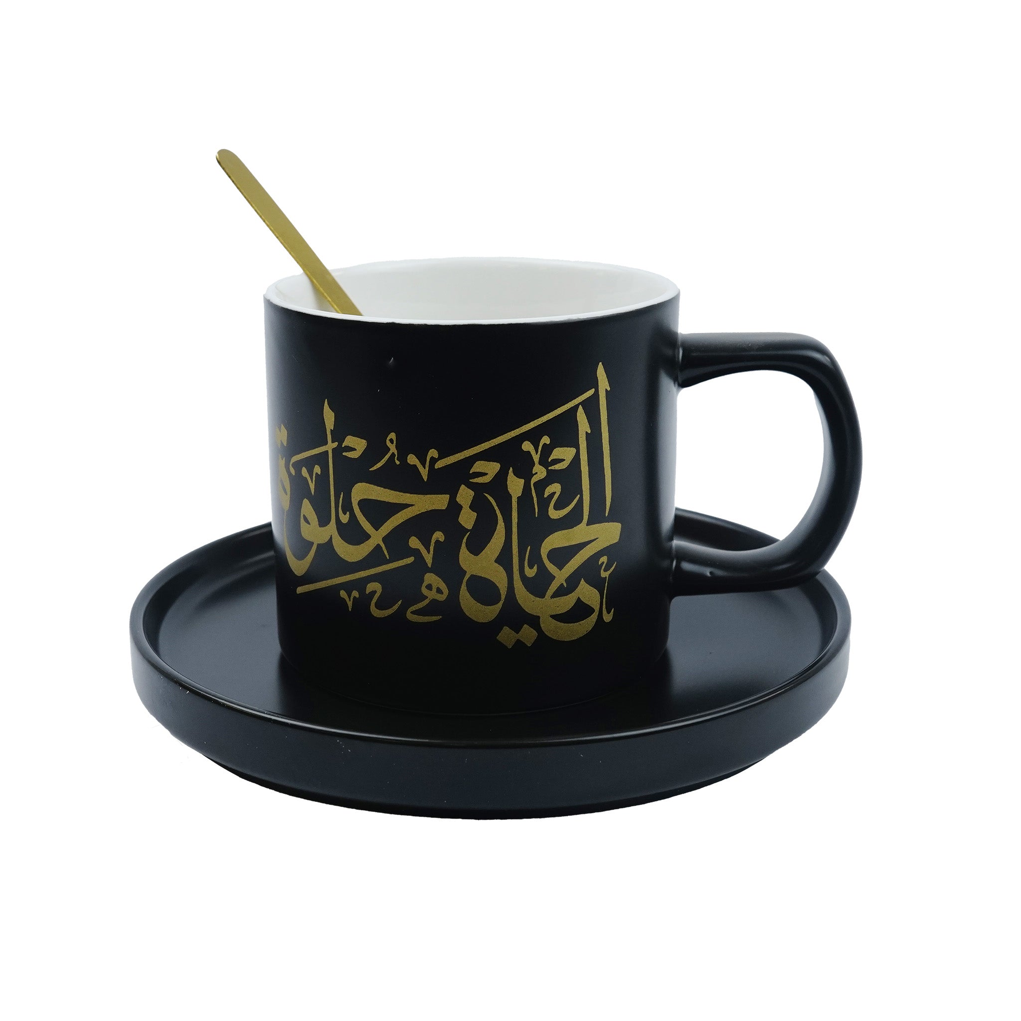 Black/White & Gold Arabic Calligraphy Style Ceramic Mug, Dish & Gold Spoon Set (SJ-1385-19)