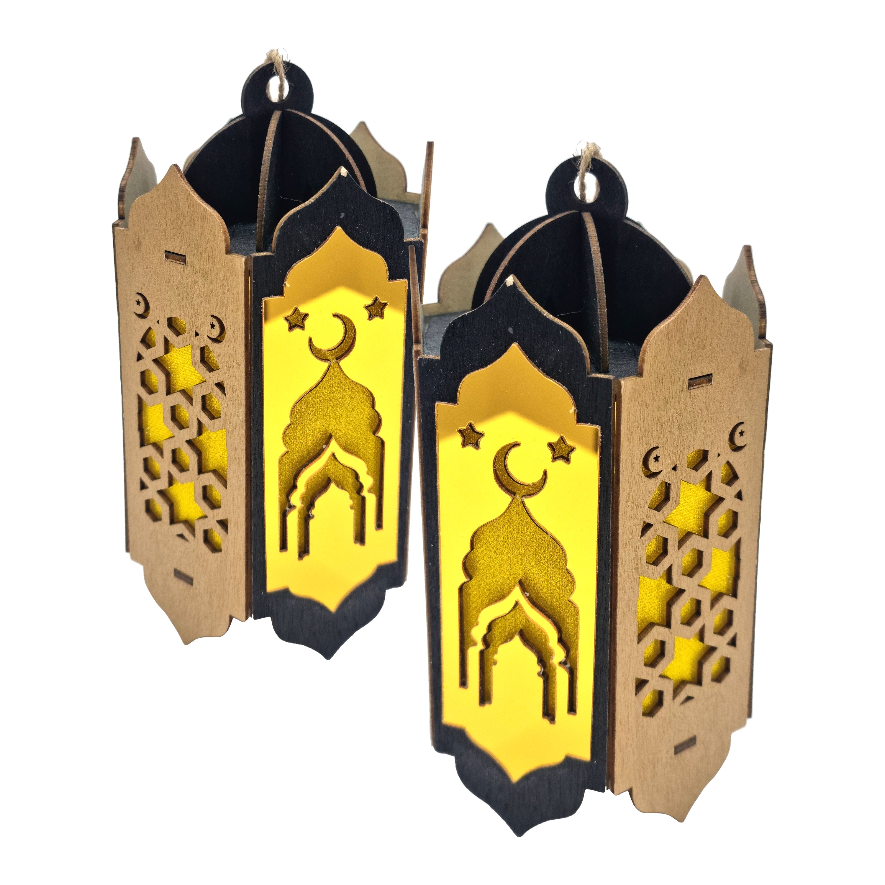Pack of 2 Wooden Shabby Chic Table / Hanging Lantern Decoration - Black / Gold Cut Out Mosque