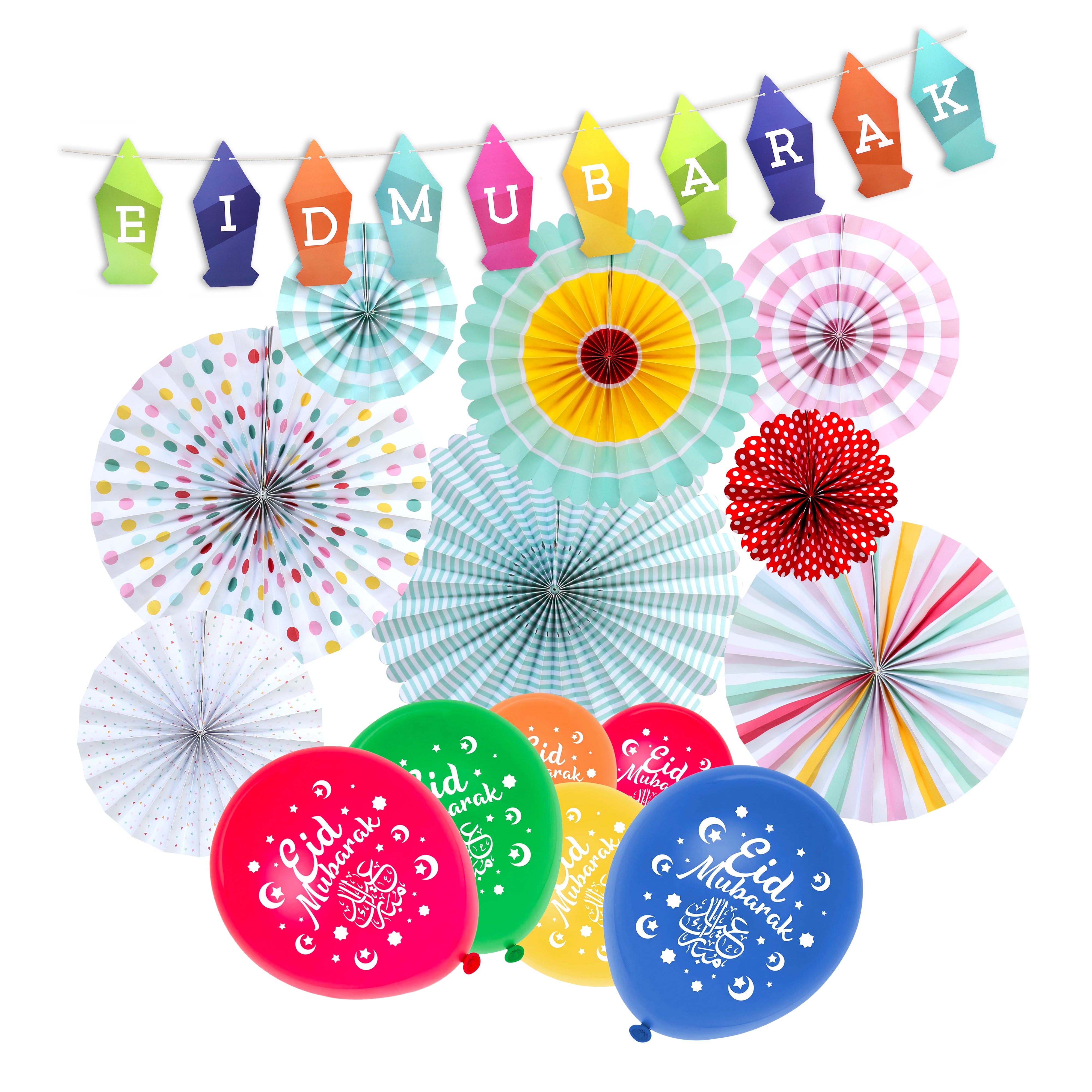 • Set includes multicolour Eid Mubarak lantern bunting, 6 assorted pastel colour paper fans & Eid Mubarak multicolour balloons