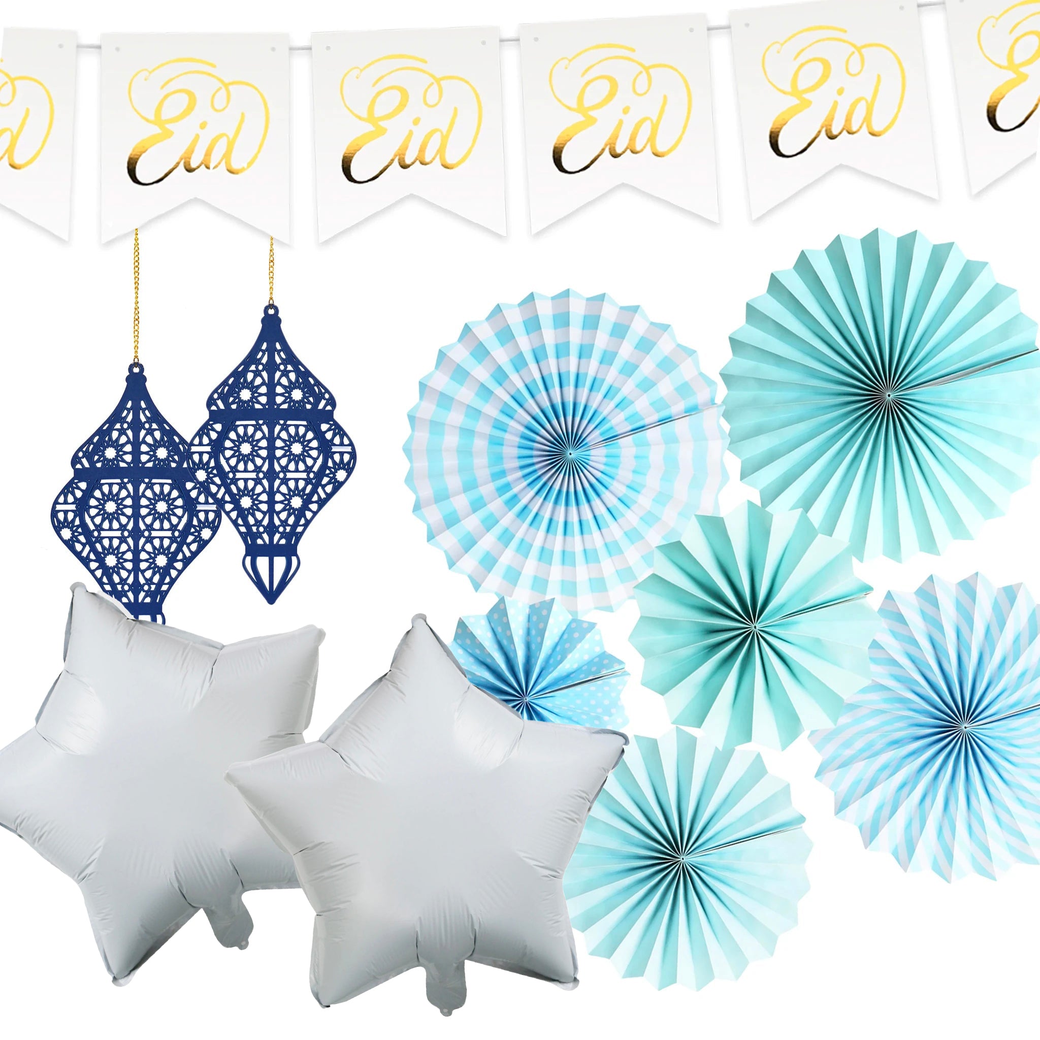 Eid Mubarak White Bunting, Blue Pastel Paper Fans, Blue Foil Star Balloons & Blue Wooden Lanterns