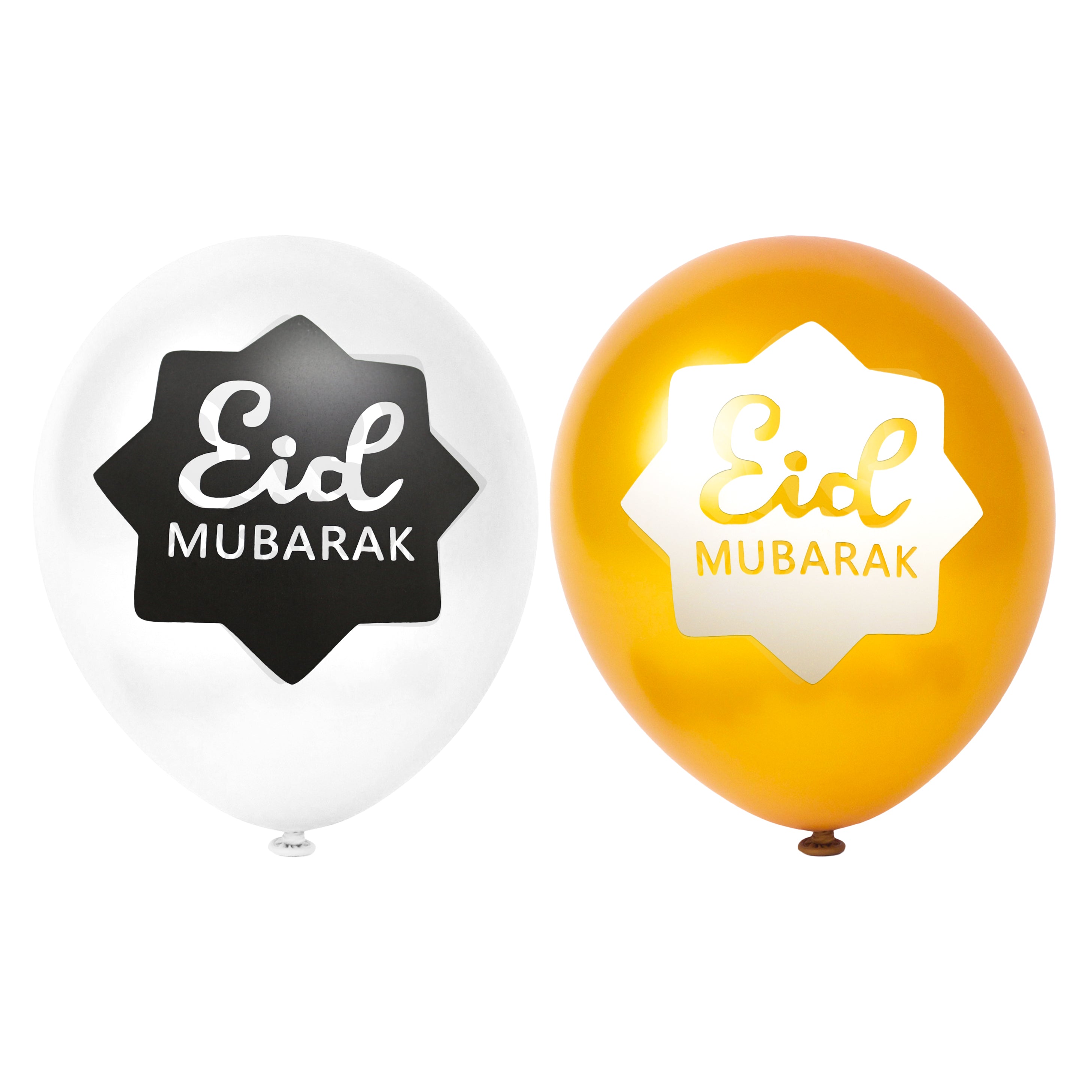• Pack of 12 gold & white Eid Mubarak latex balloons