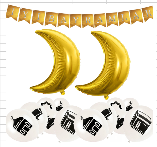 • Gold iyi Bayramlar Bunting, Gold Foil Crescent Moon Balloons & White Islamic Symbol Balloons Set