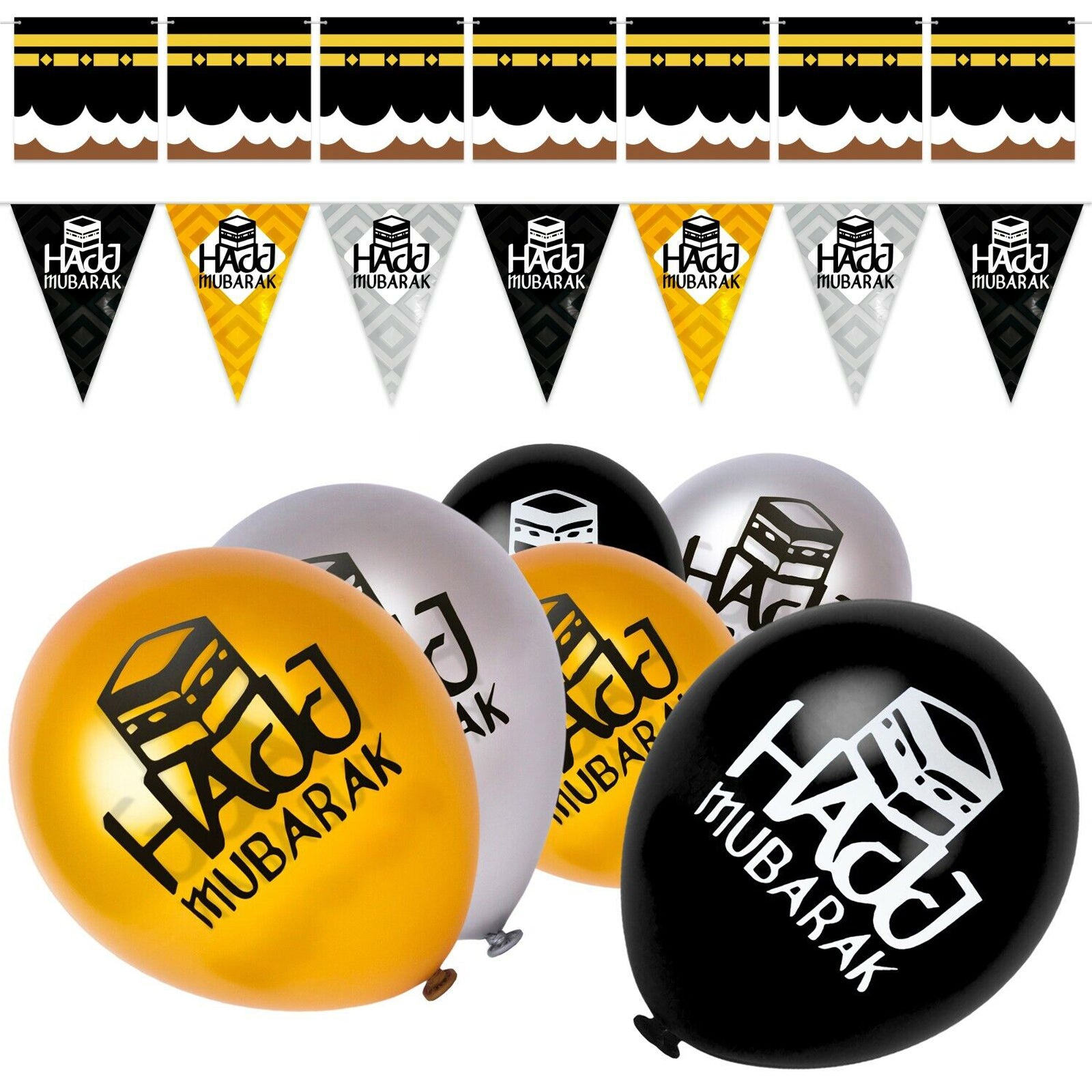Gold, Silver & Black Hajj Mubarak Kaaba Balloons, Hajj & Kaaba Card Bunting: Set 5
