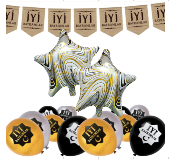 Iyi Bayramlar Hessian Bunting, 2 Gold Marble Foil Star Balloons & Gold, Silver & Black Balloons Decoration Set