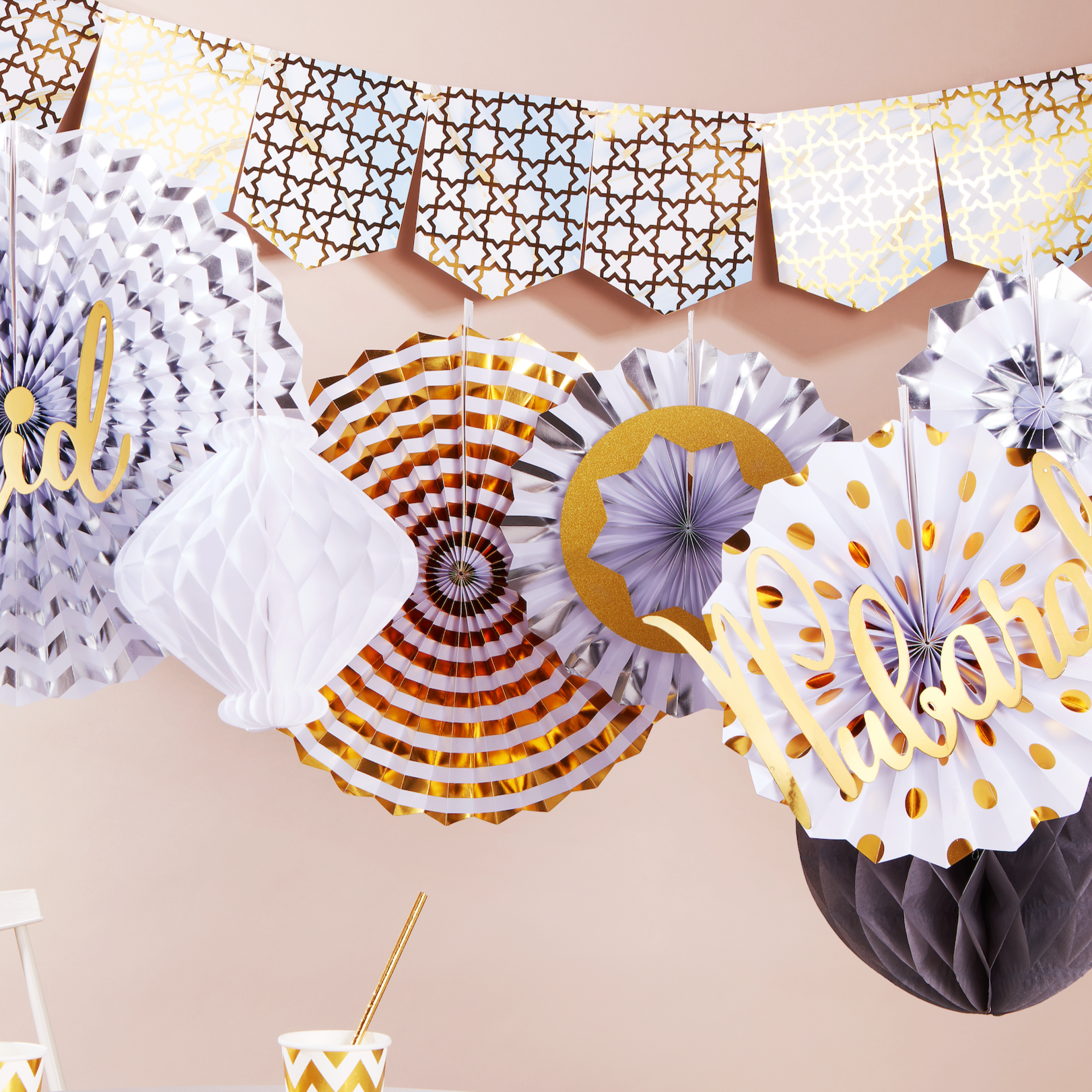 • A Metallic foil star pattern bunting on marble effect background
