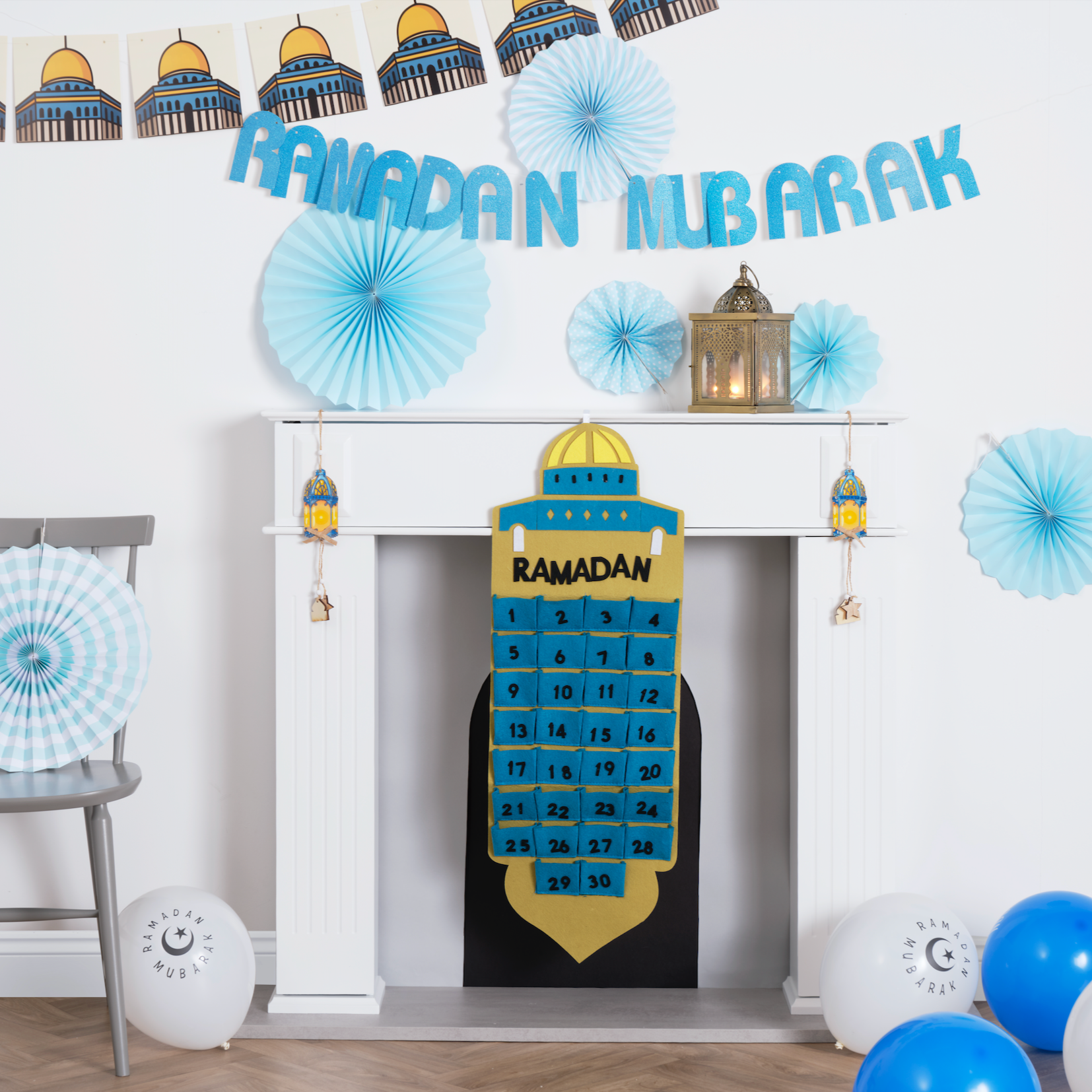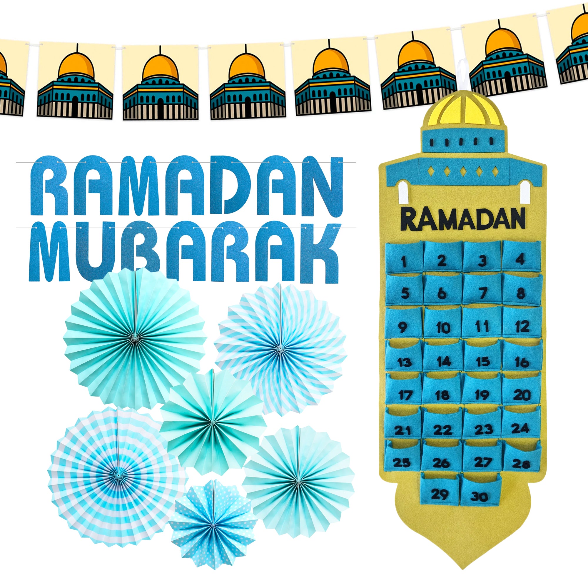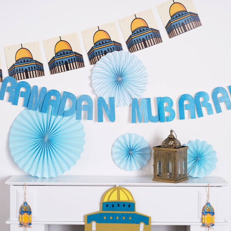 • An Al-Aqua Mosque decoration set including a Ramadan calendar, 2 types of bunting and 6x blue paper hanging fans