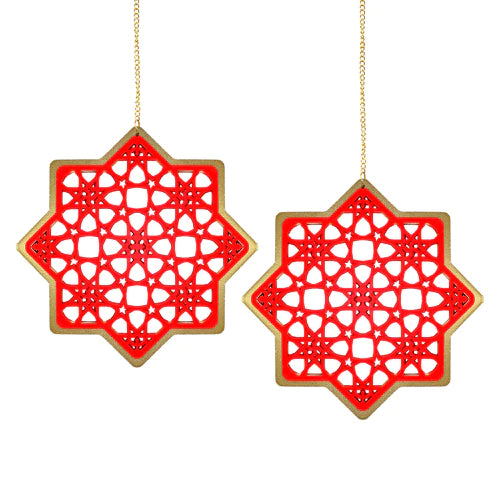• Red With Gold wooden hanging stars on chain approx: H:18cm x W:18cm x D:1cm