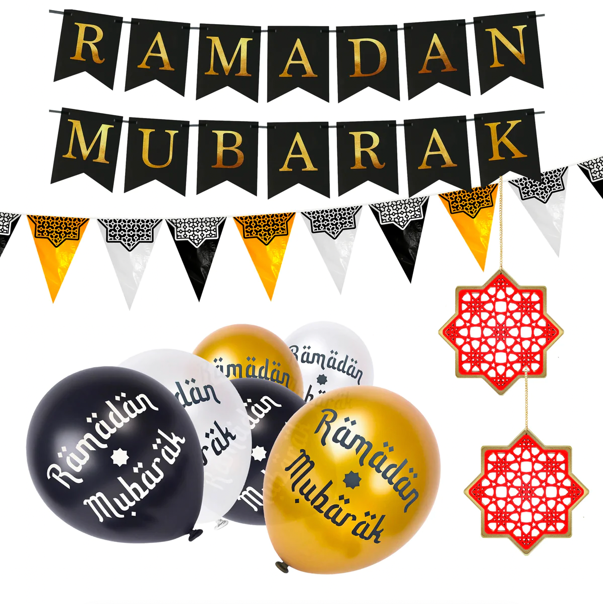 Black, Gold & Silver Islamic Star Eid Balloons & Bunting & Red With Gold Outline Wooden Stars Ramadan Decoration Set