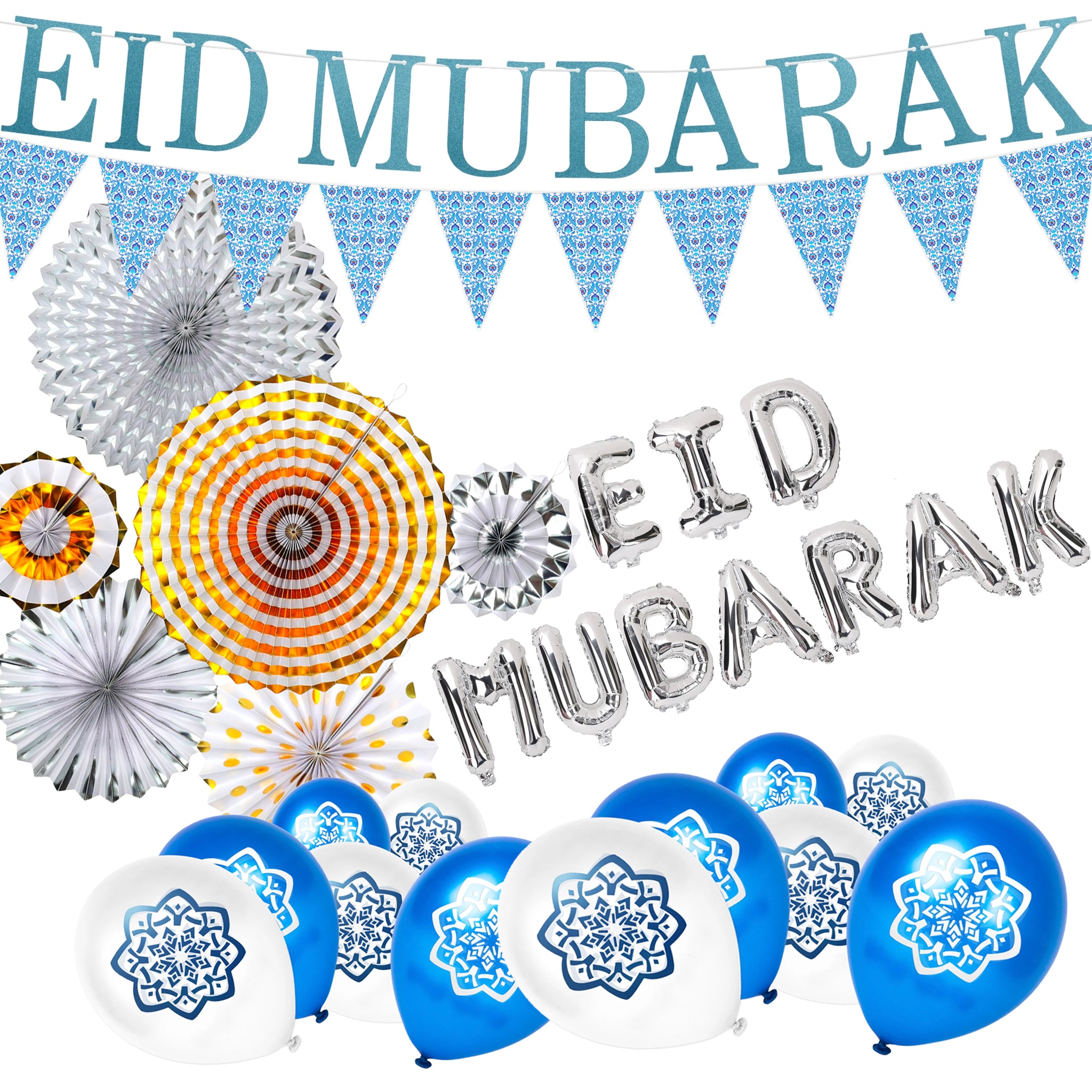 Blue Eid Letter Bunting, Blue Ottoman Bunting, Silver & Gold Fans, Silver Eid Foil Balloon & Blue/White Balloon Decoration SET 10