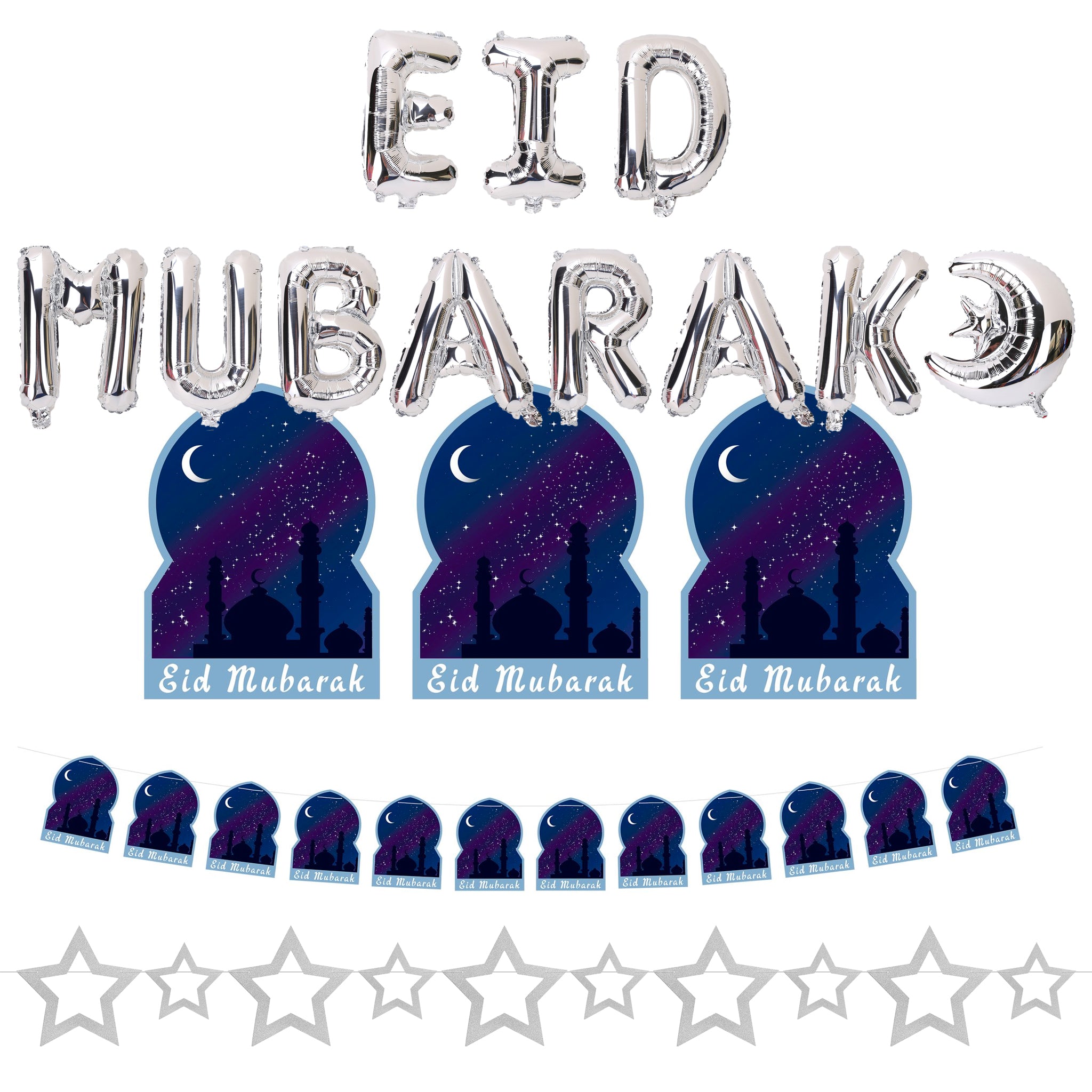 Blue Night Eid Mubarak Bunting, Silver Glitter Star Bunting & Silver Foil Eid Mubarak Balloons