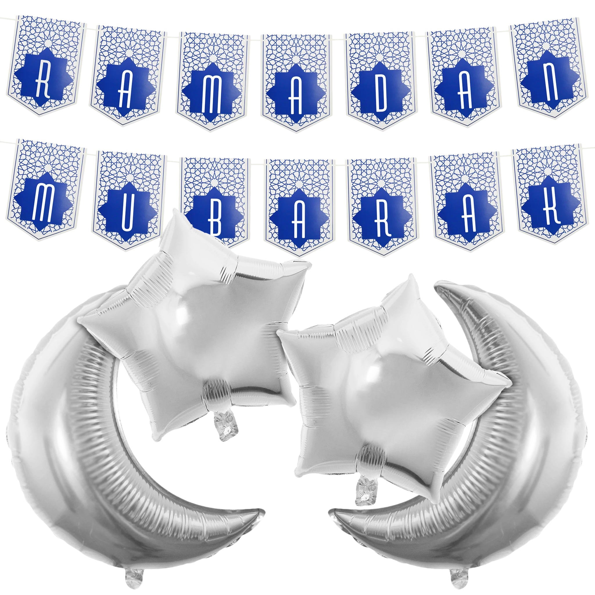 Blue Ottoman Ramadan Mubarak Bunting with 4x Silver Moon & Star Foil Balloons