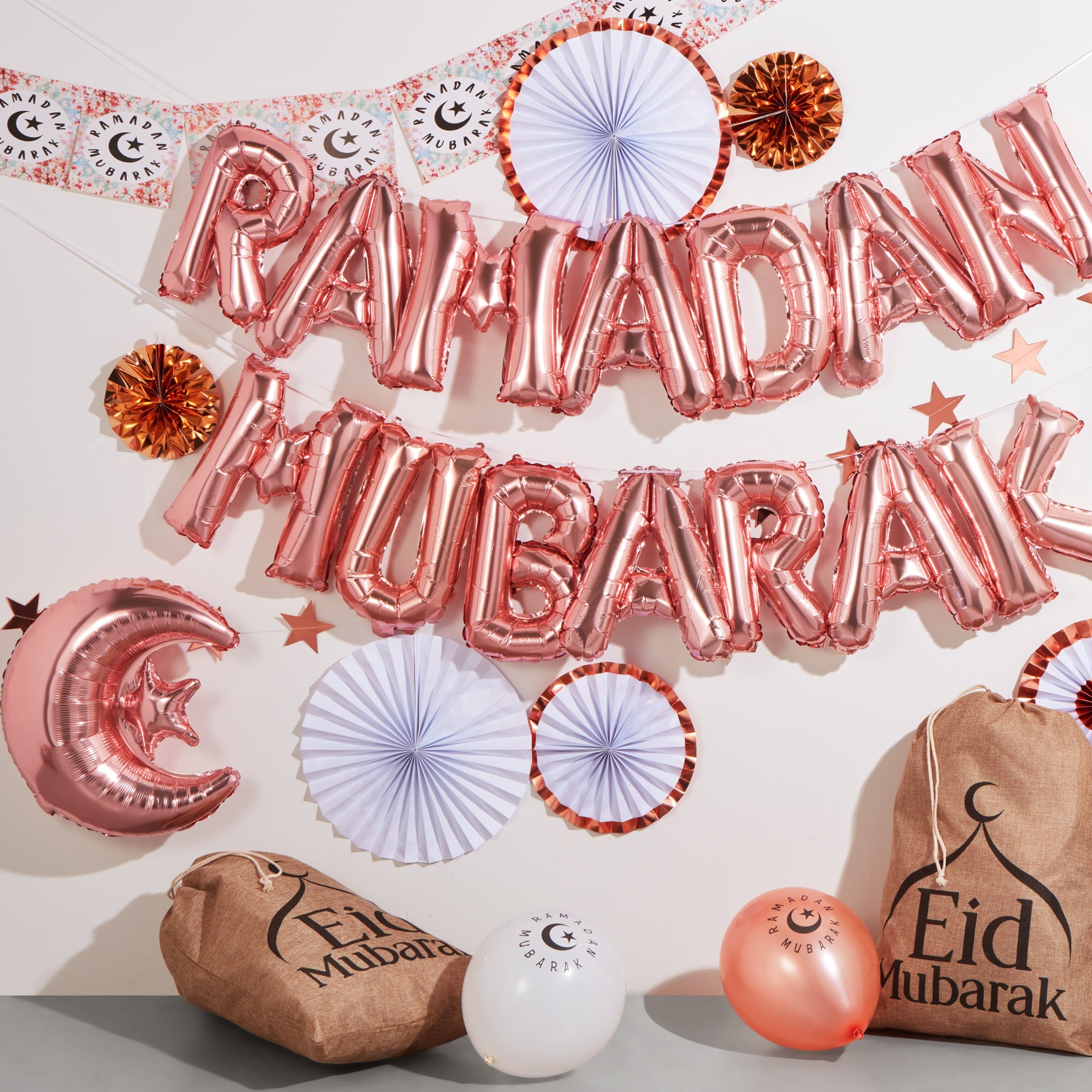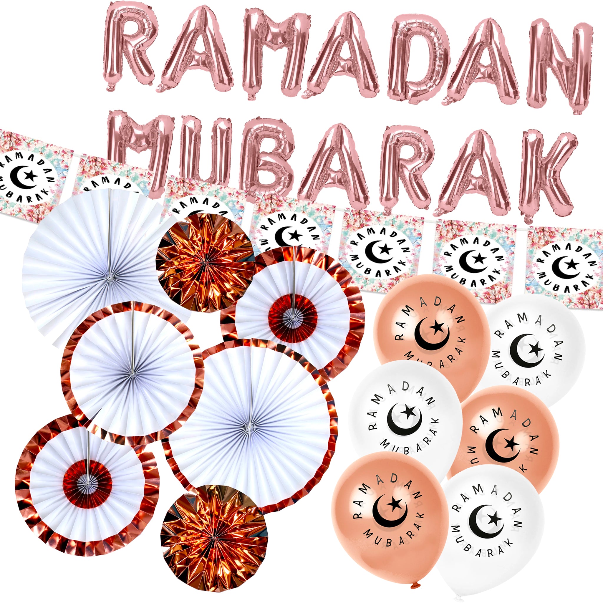 Floral Ramadan Mubarak Bunting, Rose Gold Paper Fans, Latex & Foil Balloons Set