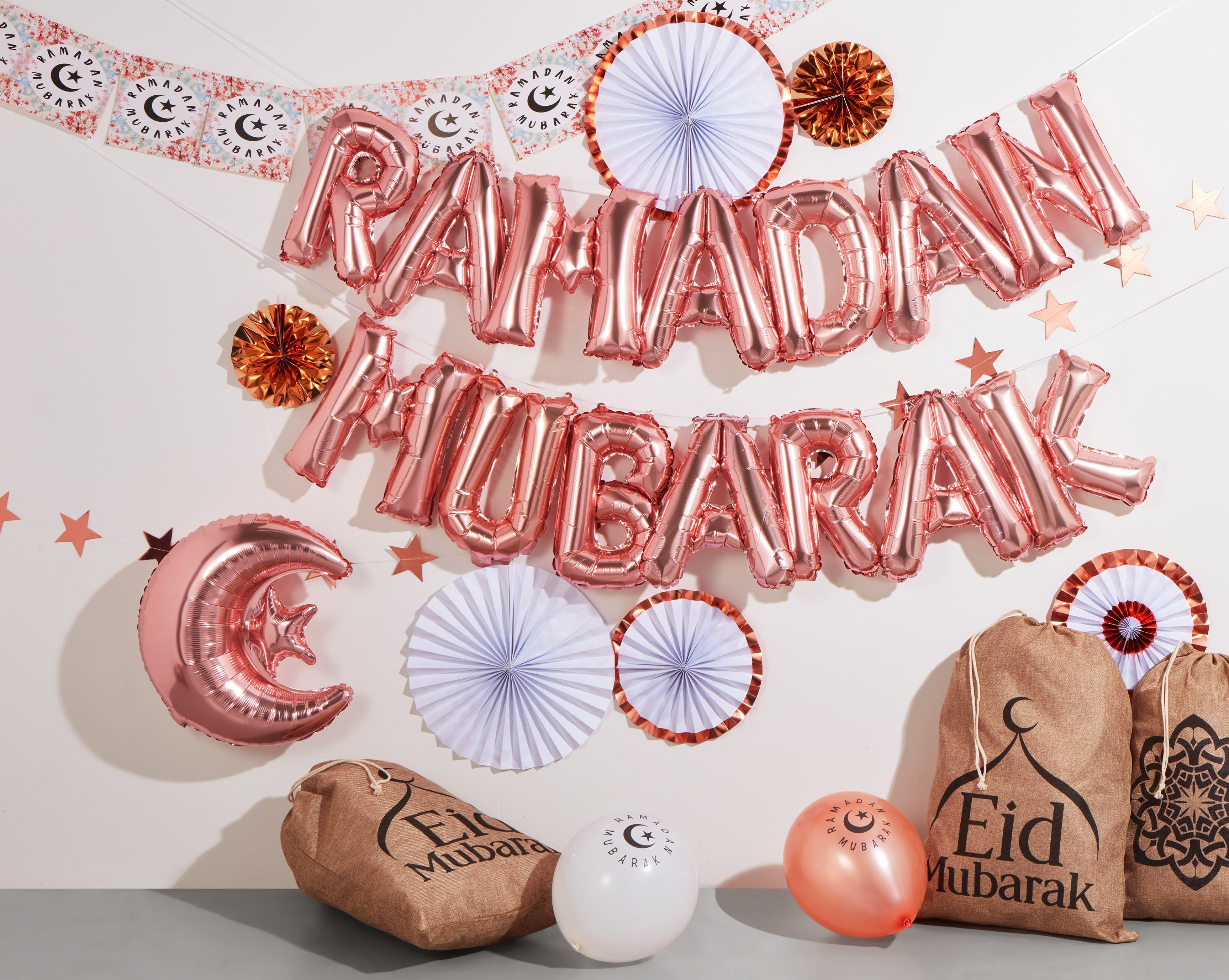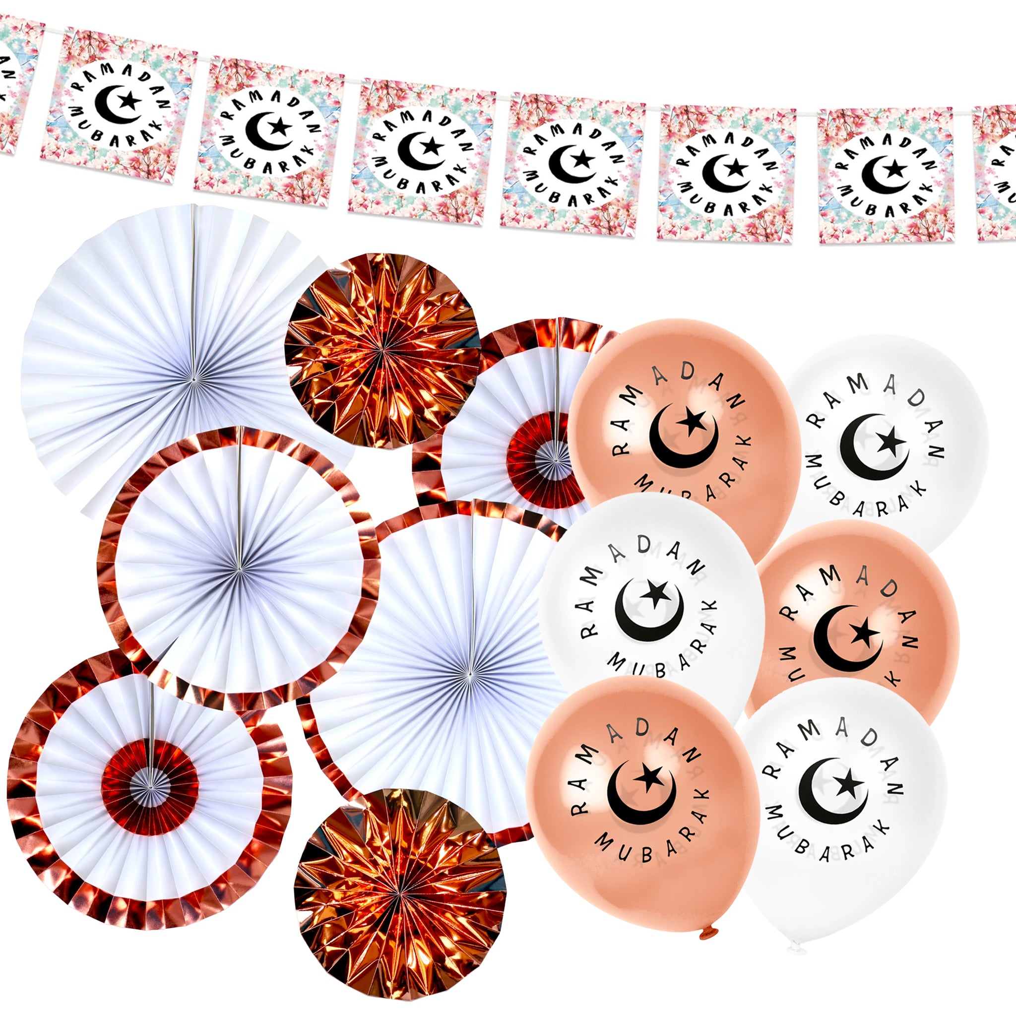 Floral Ramadan Mubarak Bunting, Rose Gold Paper Fans & Matching Balloons Set