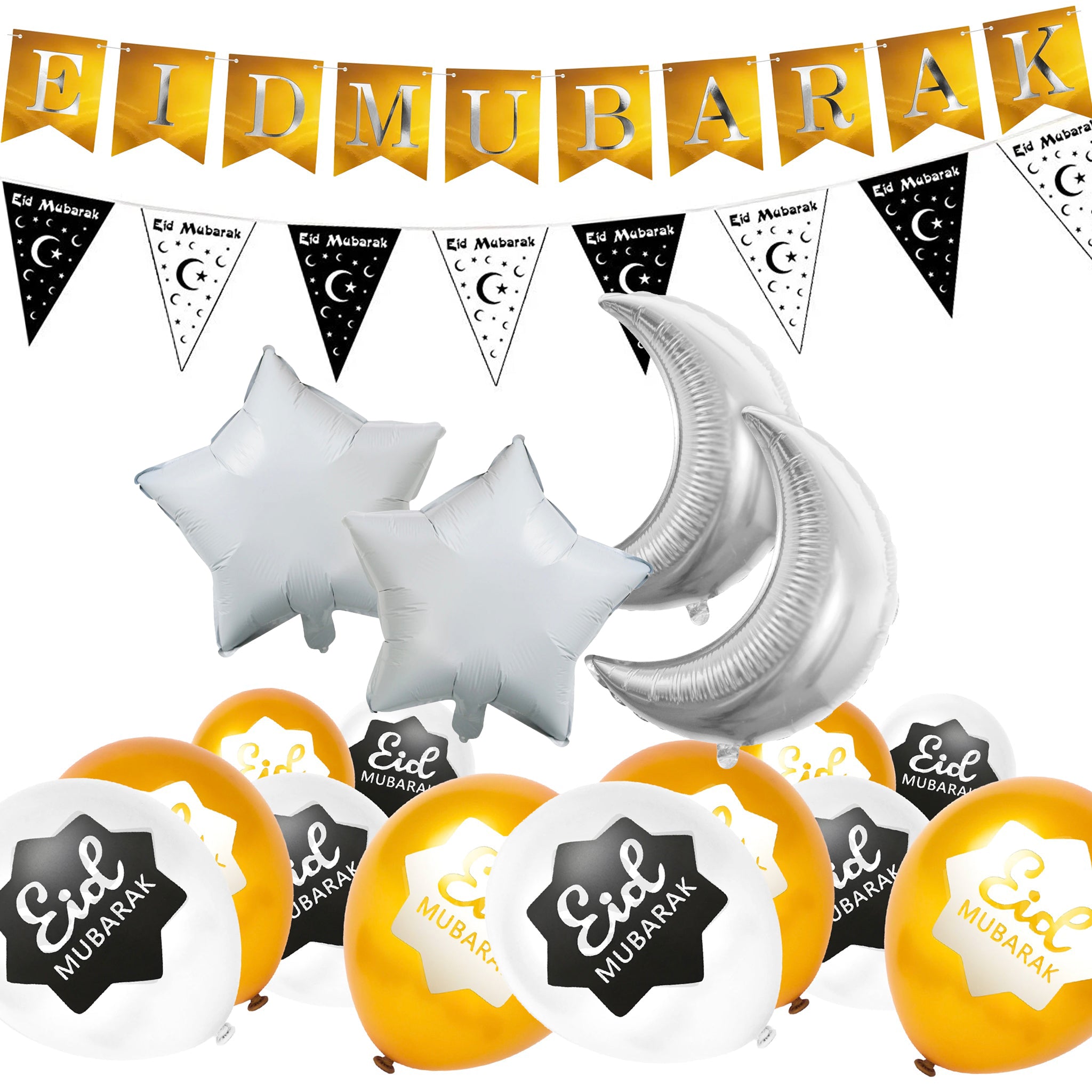 Gold Eid Letter Bunting, Black & White Moon Bunting, Silver Foil Moon & Star Balloons + Gold & White Eid Balloons Decoration SET 15
