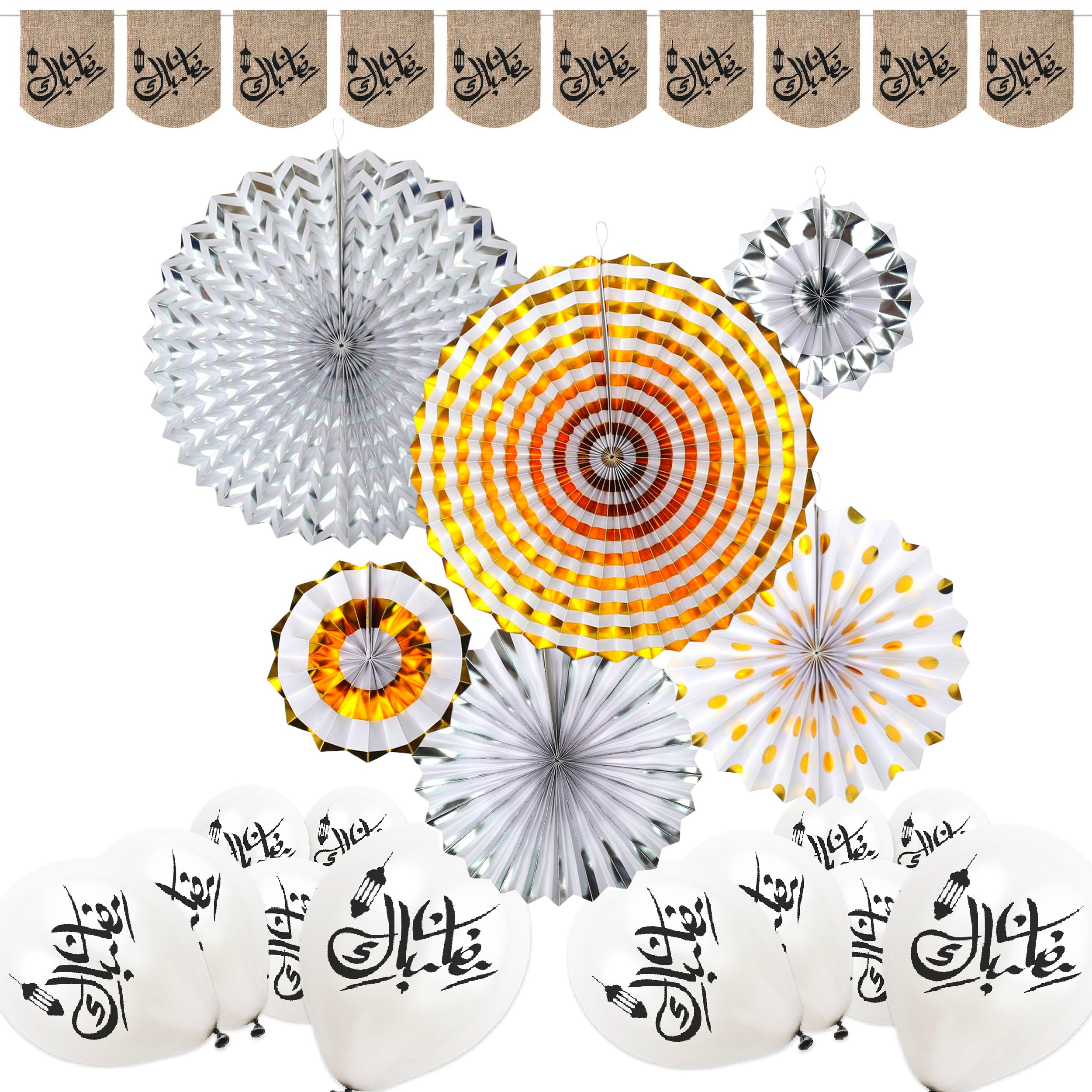 Gold, Silver & Hessian Ramadan Mubarak Fan, Bunting & Balloon Set 12/21