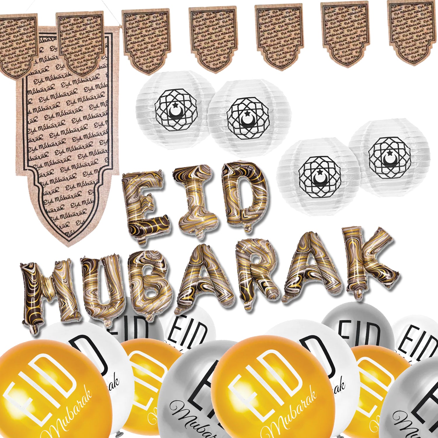 Marble 'Eid Mubarak' Foil Balloons, Hessian Bunting & Scroll, Latex Balloons & Lanterns Set (Set 23-8)