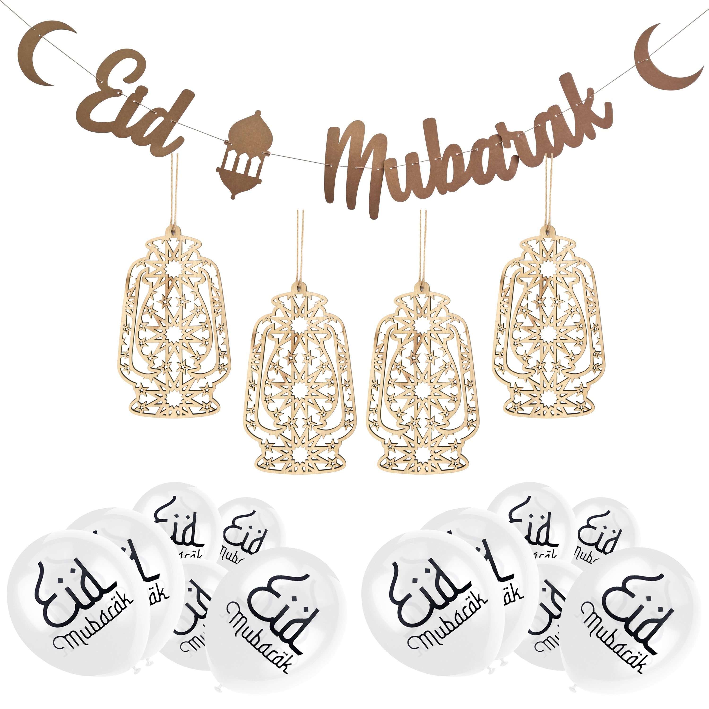 Natural 'Eid Mubarak' Card Garland, 4 x Wooden Lanterns & White Balloons Set (Set 22-9)