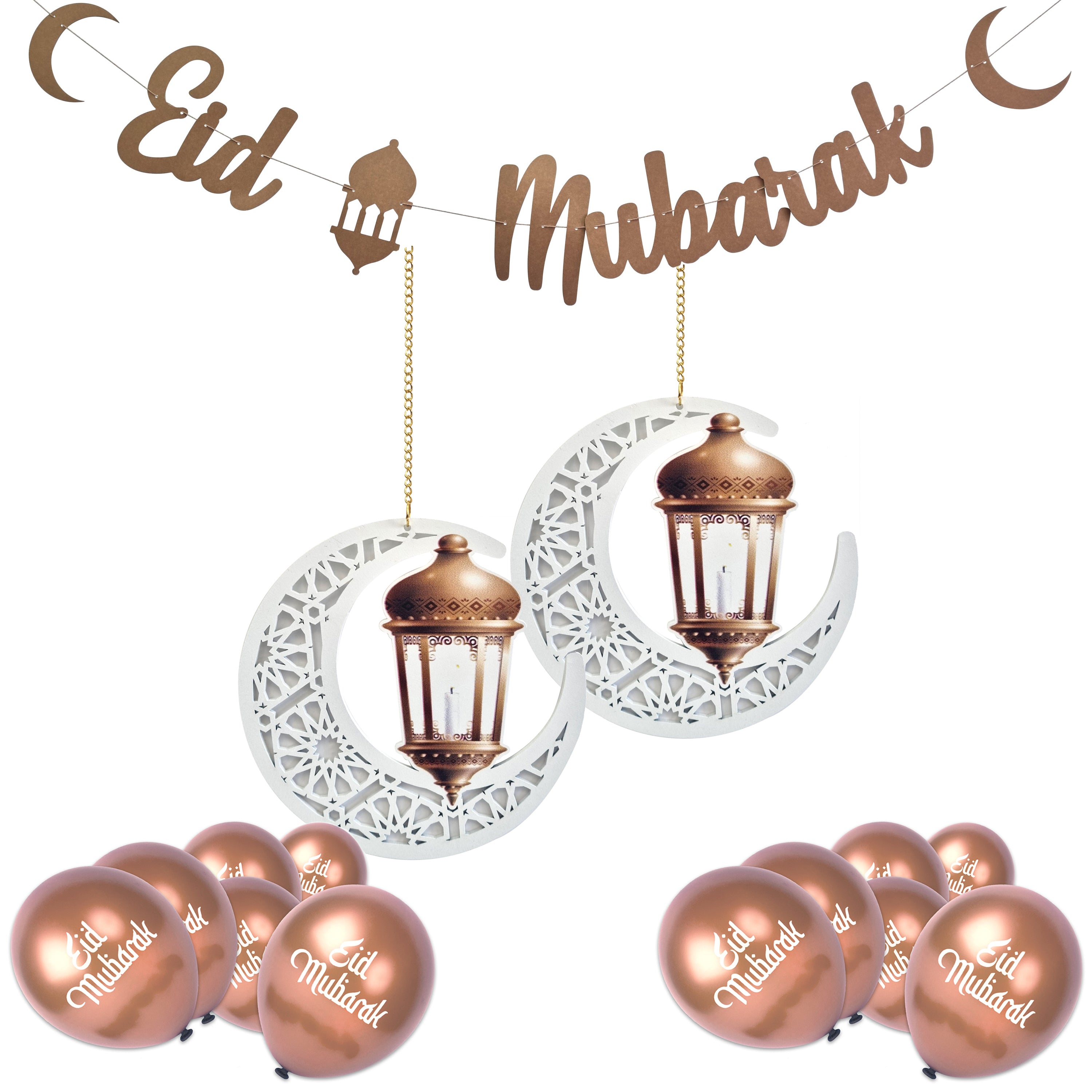 Natural 'Eid Mubarak' Garland, 2 x Wooden Lanterns & Balloons Set (Set 22-11)