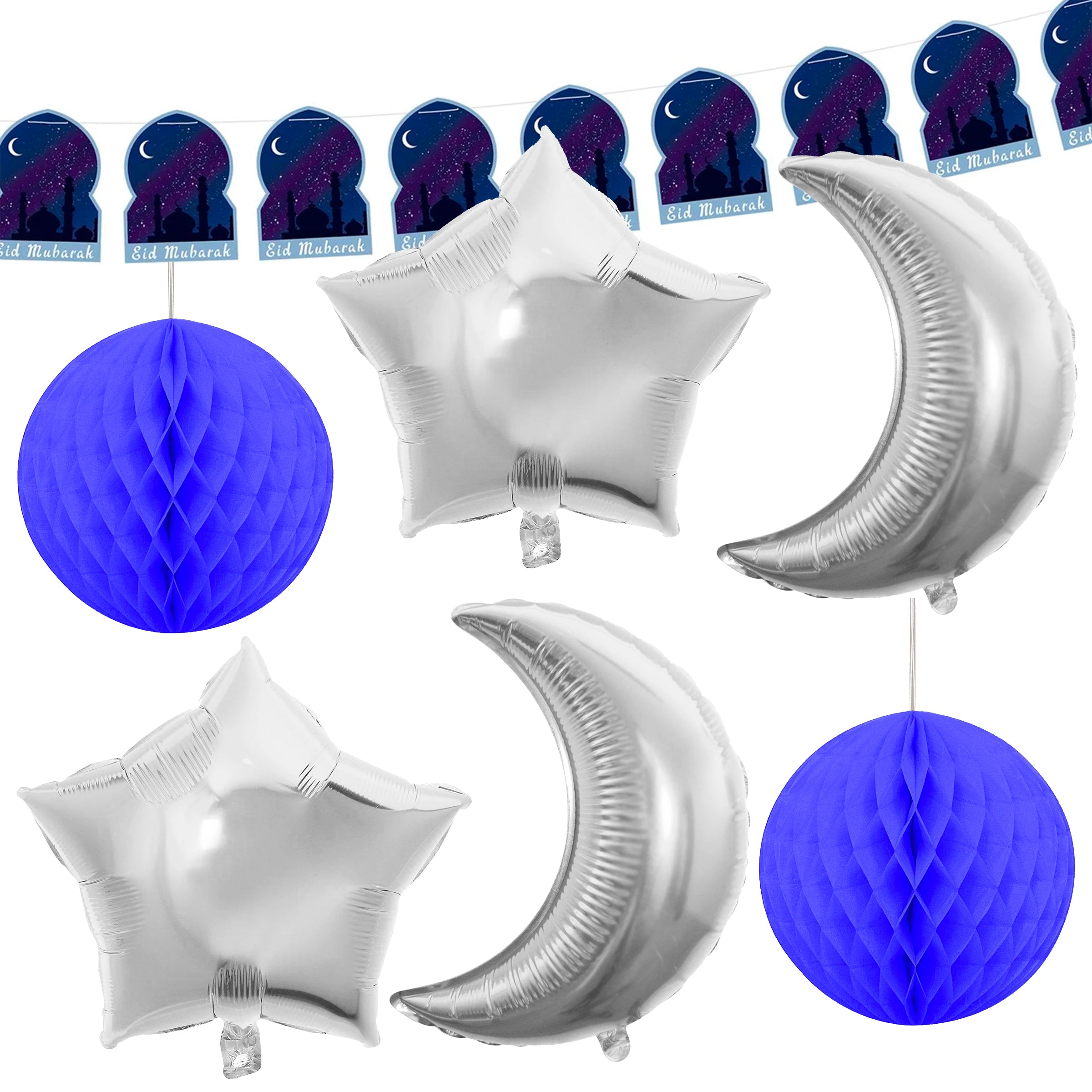 Navy Mosque Bunting, 4pc Foil Moon & Star Balloons + 2pc Blue Honeycombs Decoration SET 12