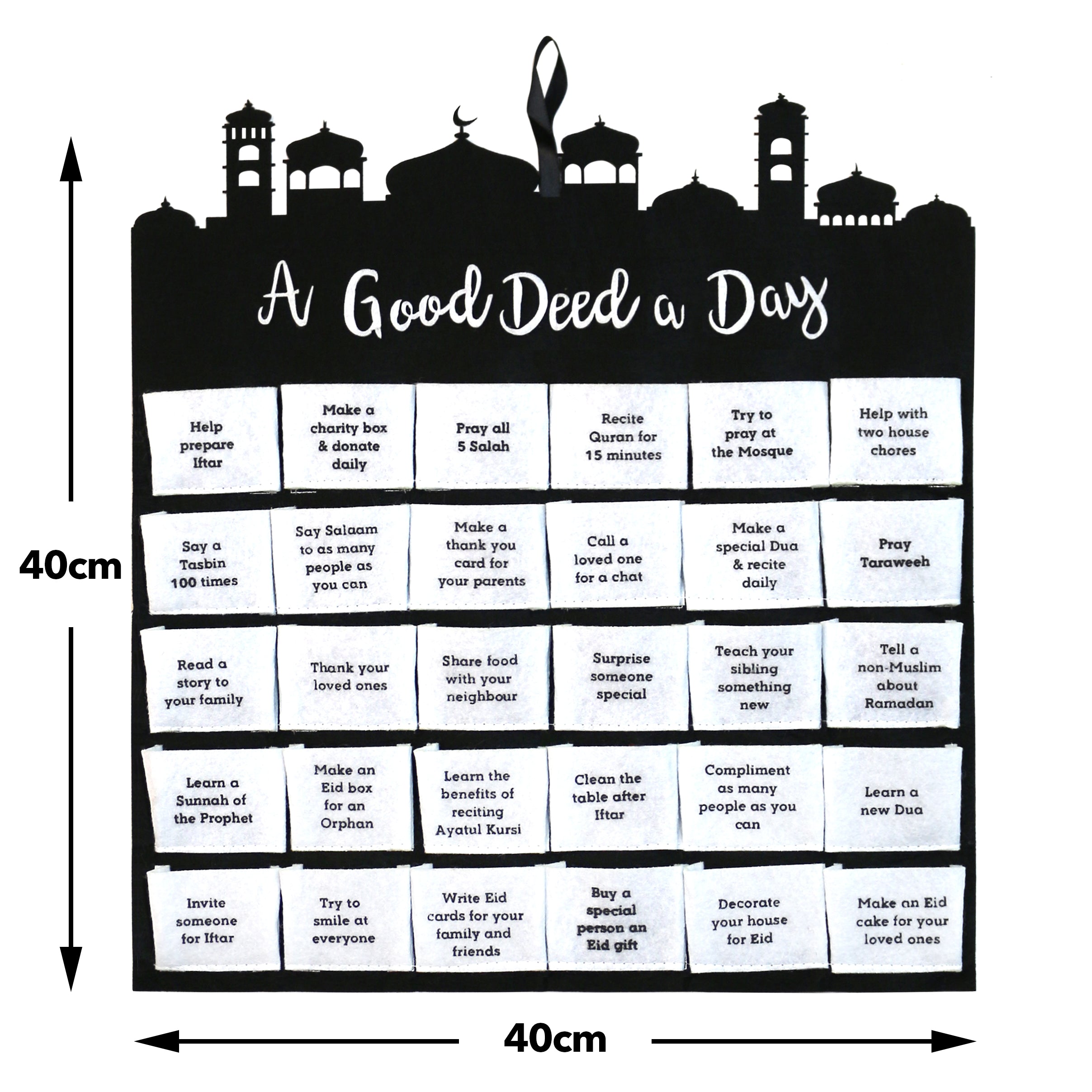• Each pocket is printed with a good deed a day for the month of Ramadan