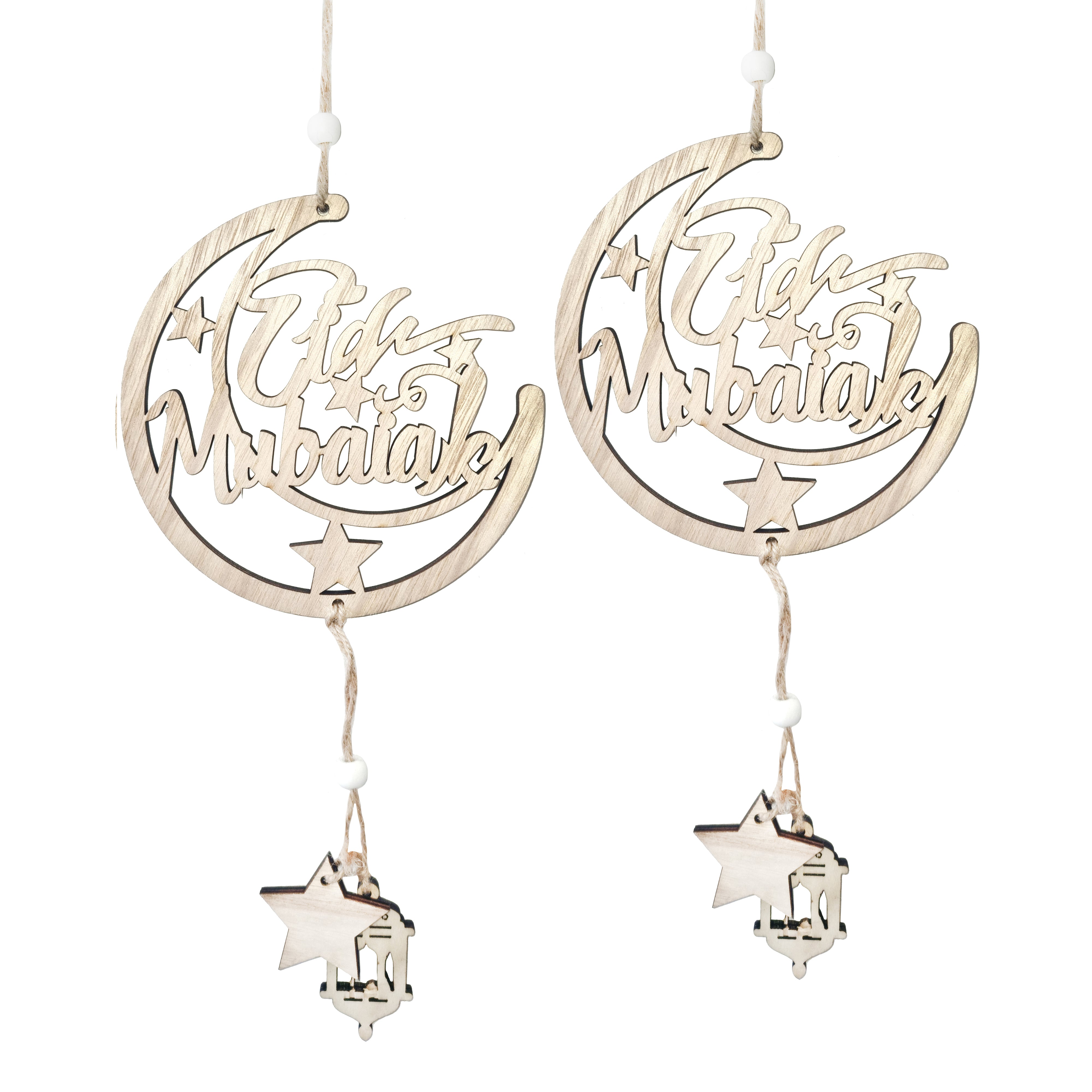 • Pack of 2 wooden Eid Mubarak hanging crescent moon decorations