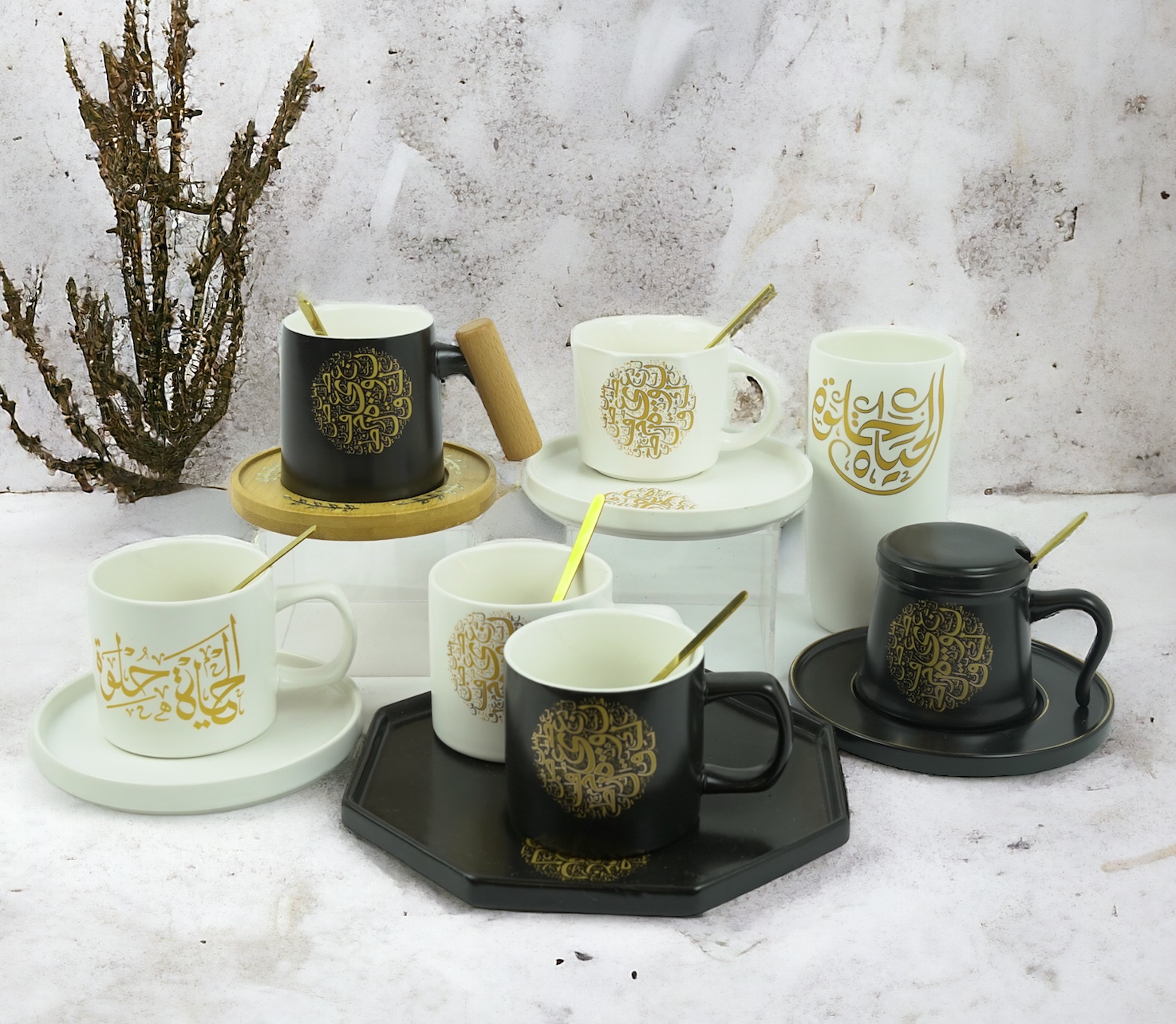 black-white-arabic-calligraphy-octagonal-style-mug-large-dish-spoon