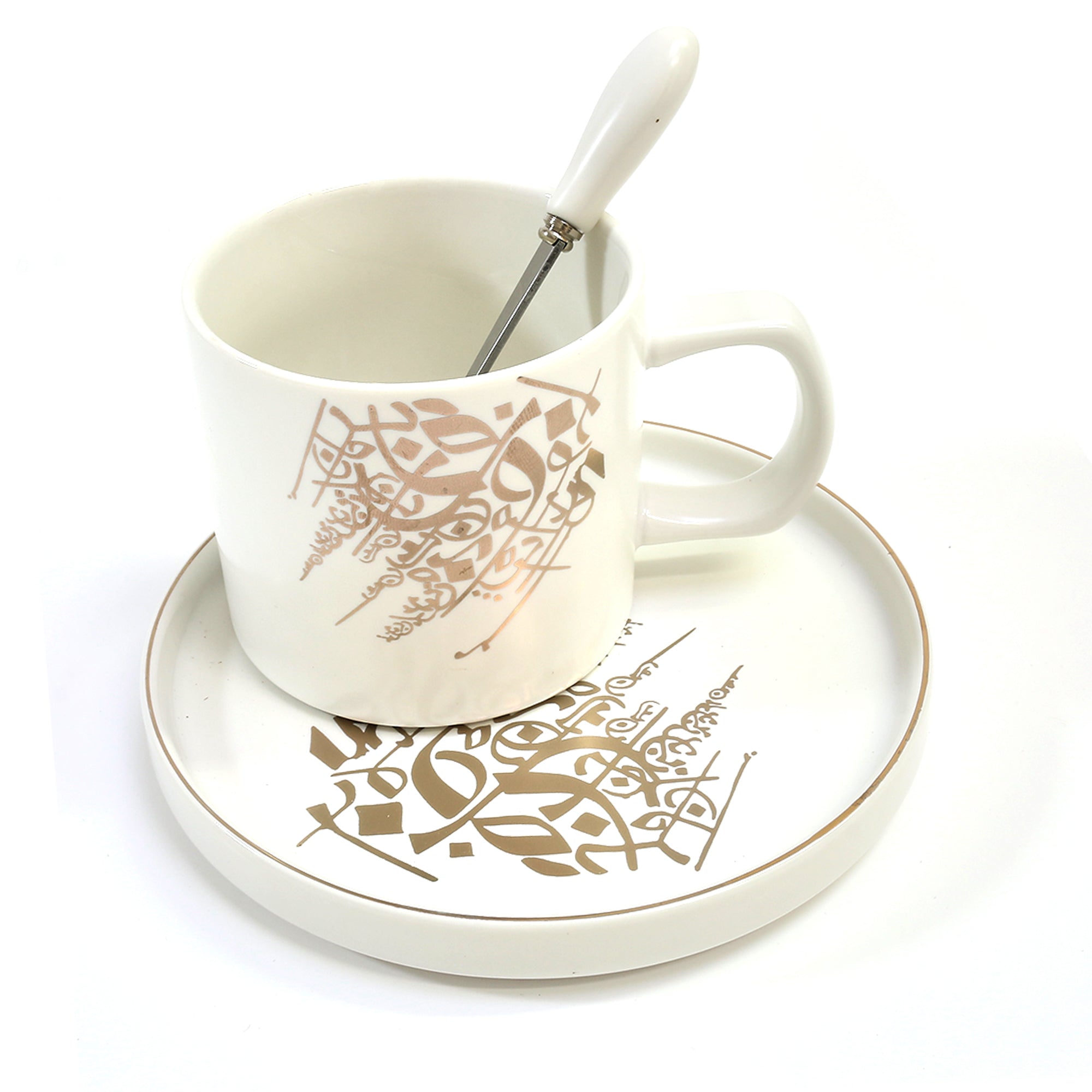 Black/White & Gold Arabic Calligraphy Style Ceramic Mug, Dish & Spoon Set (1385-9)