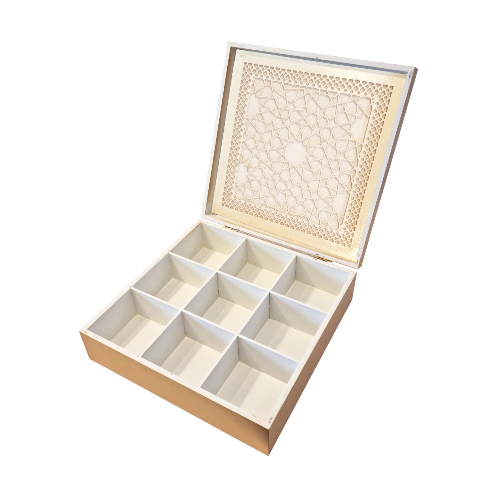 Gold Wooden Hinged Display Box - 9 Divided Sections w/ Clear/Geometric Window Lid(1802-1)