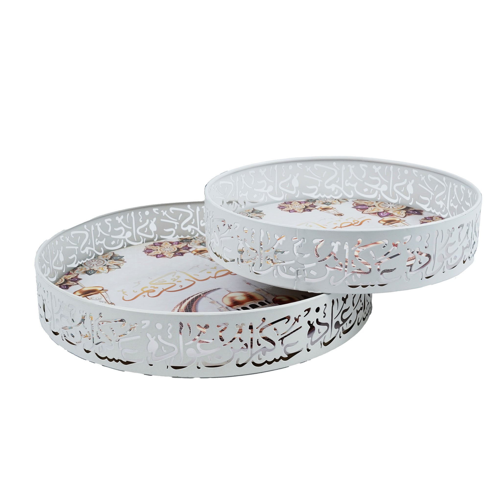 Set of 2 WHITE Metal Round ARABIC Cut Out Trays (757-27)