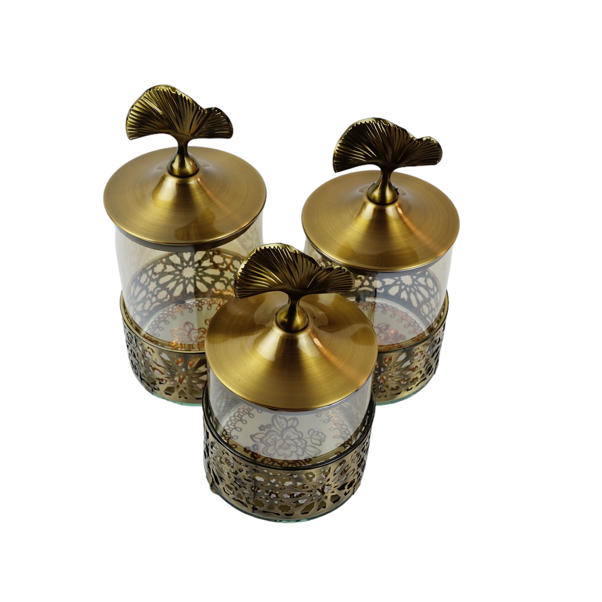 Set of 3 Brushed Bronze Ornate Lid Glass Jars (JC001)