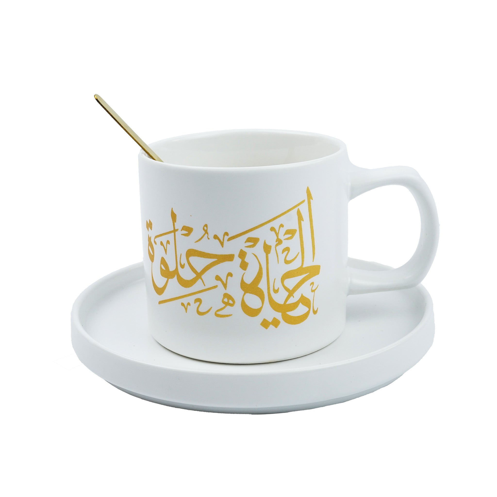 Black/White & Gold Arabic Calligraphy Style Ceramic Mug, Dish & Gold Spoon Set (SJ-1385-19)