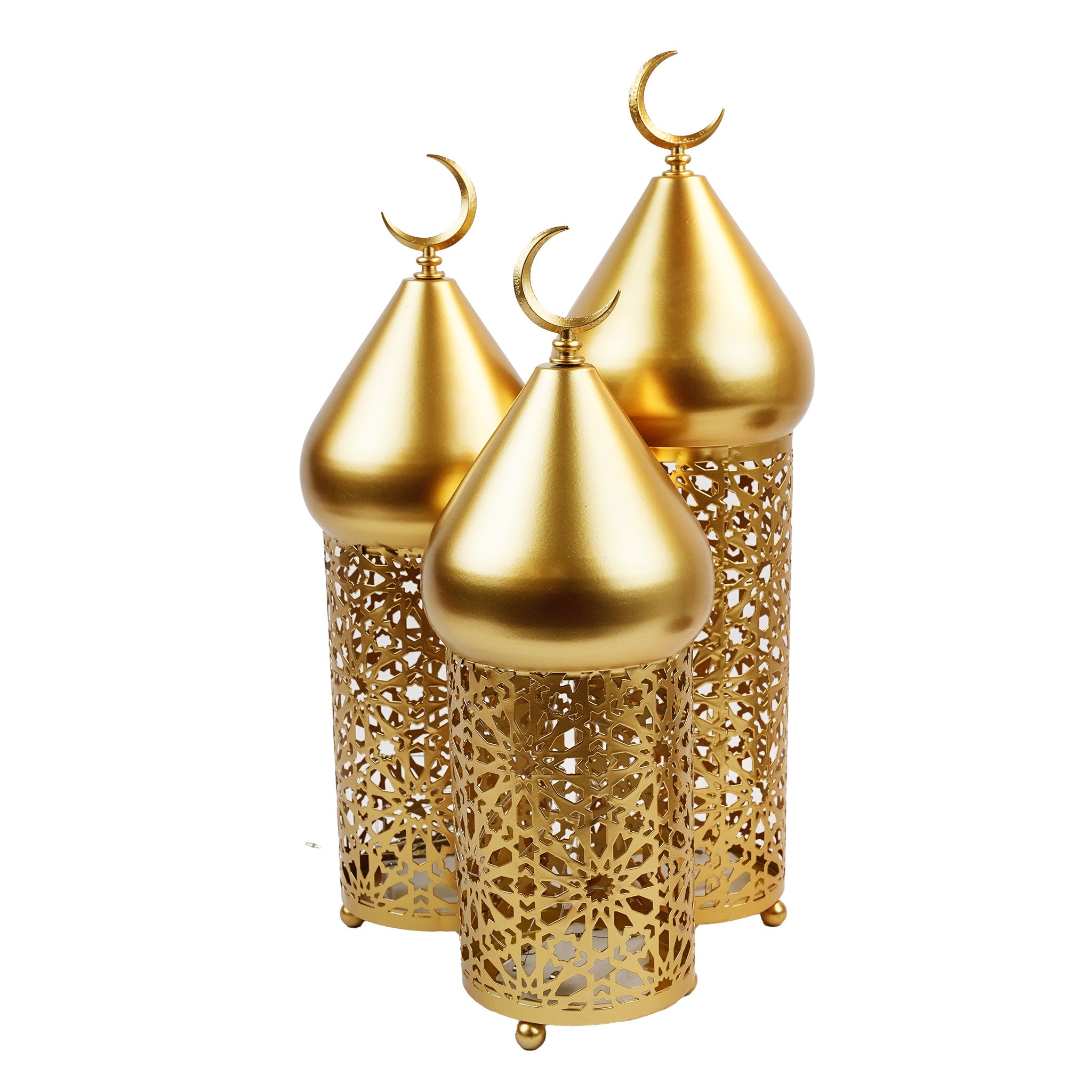 • Set of 3 Gold Minaret LED Lanterns with 3 Different sizes in Small, Medium & Large (One Of Each)
