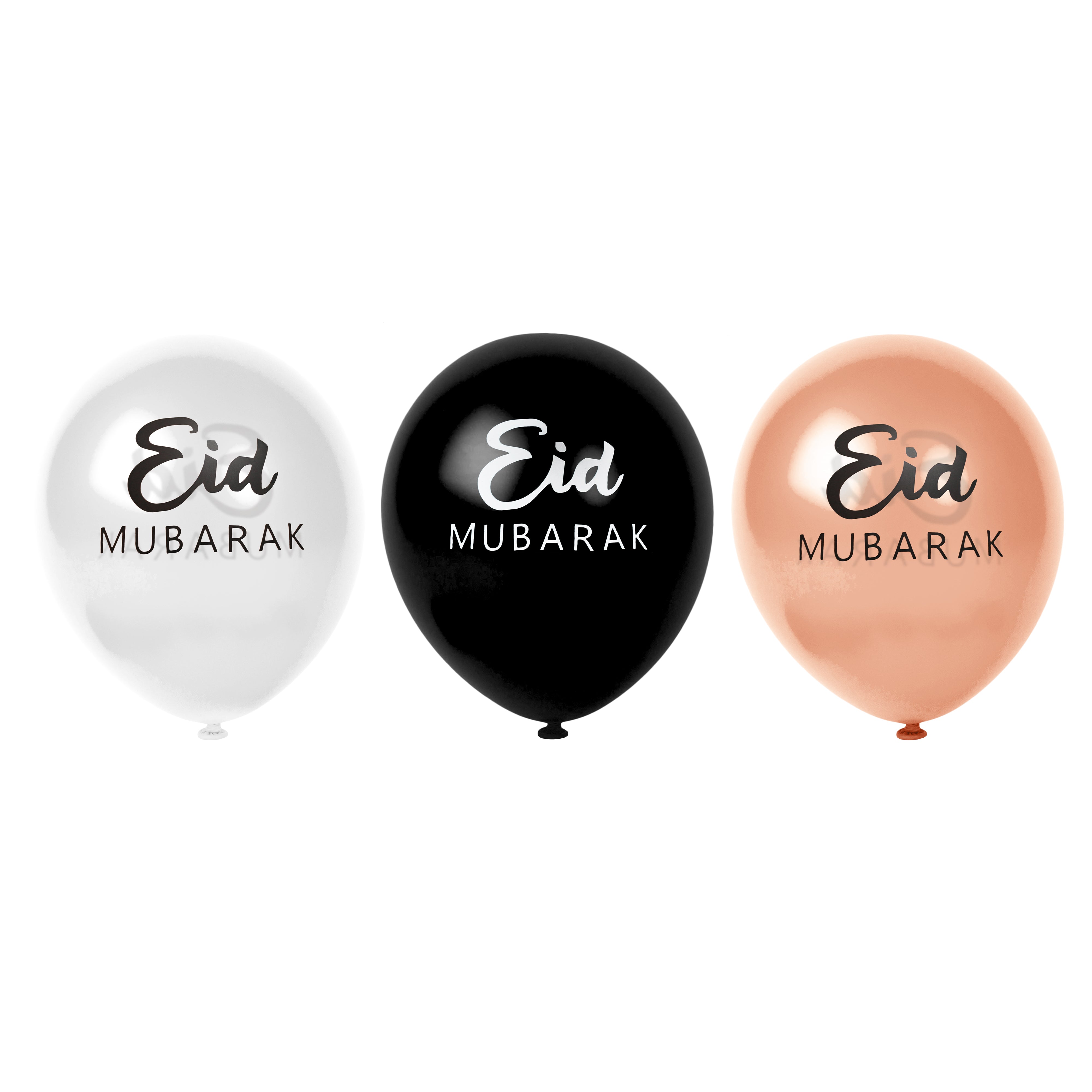 • Black, silver & rose gold Eid Mubarak balloons printed on both sides