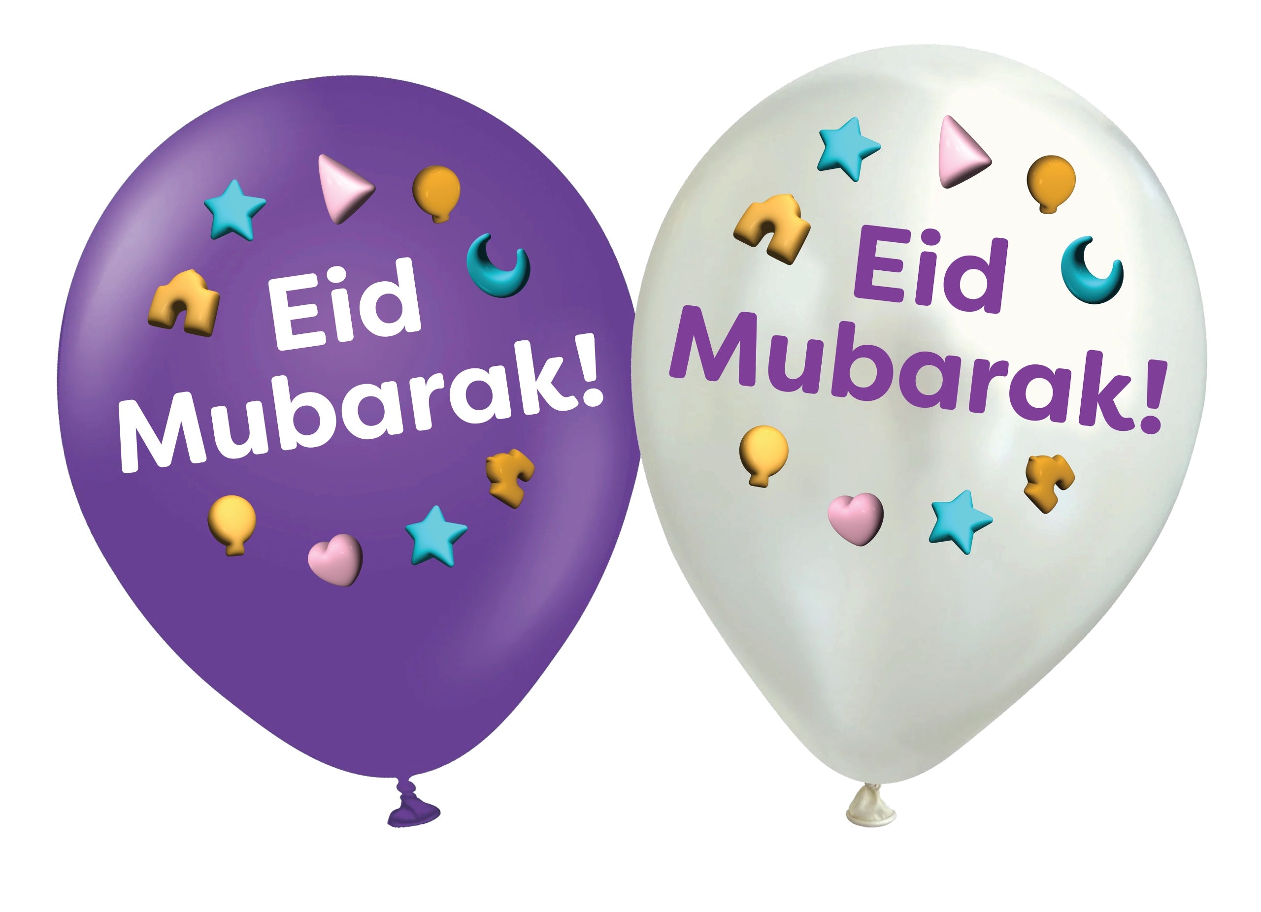 • High quality printed Purple & White Colour latex balloons - Ideal for Eid parties & events.