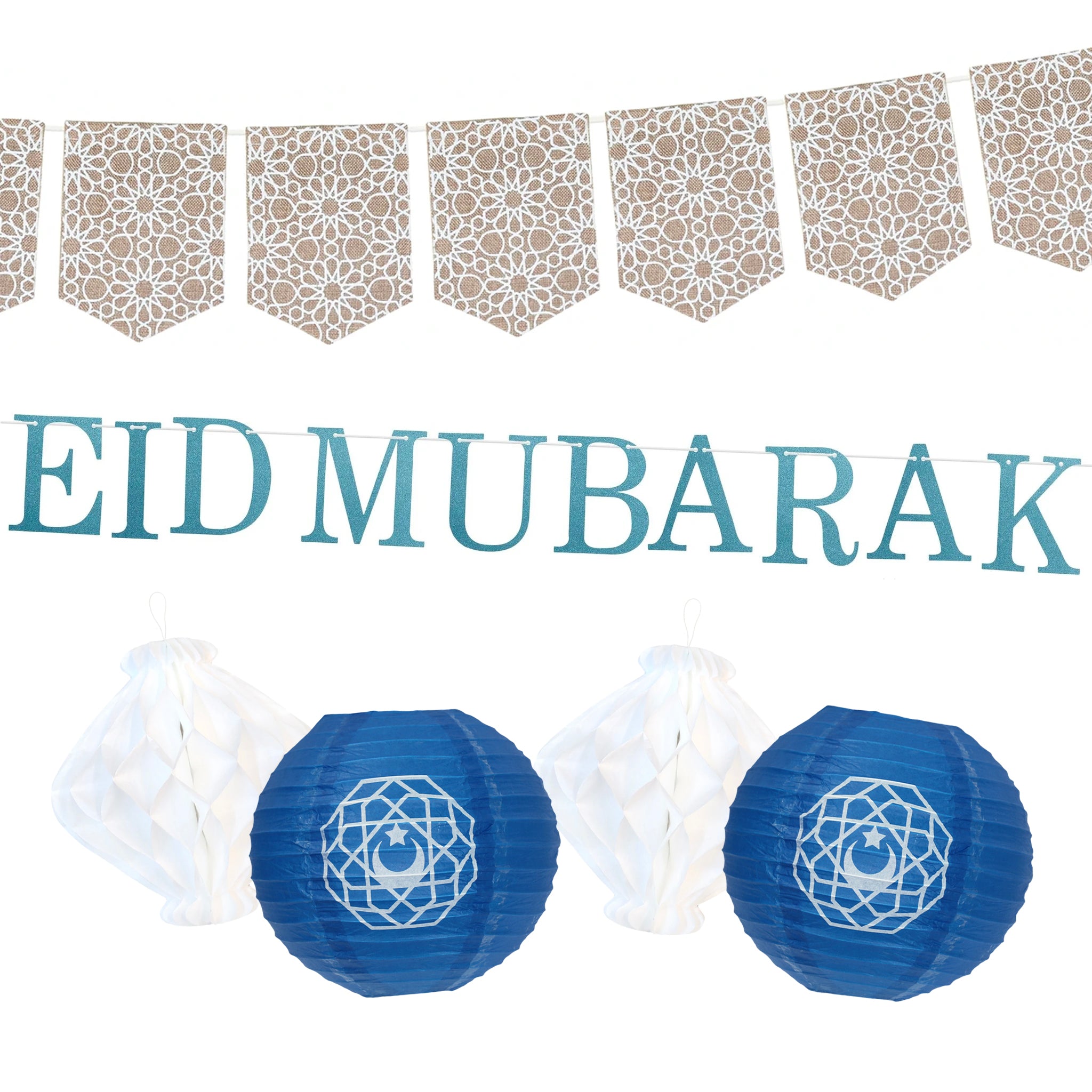 Eid Mubarak Blue Letter Bunting, Floral Hessian Bunting, White Honeycomb Balls & Blue Paper Lanterns Set