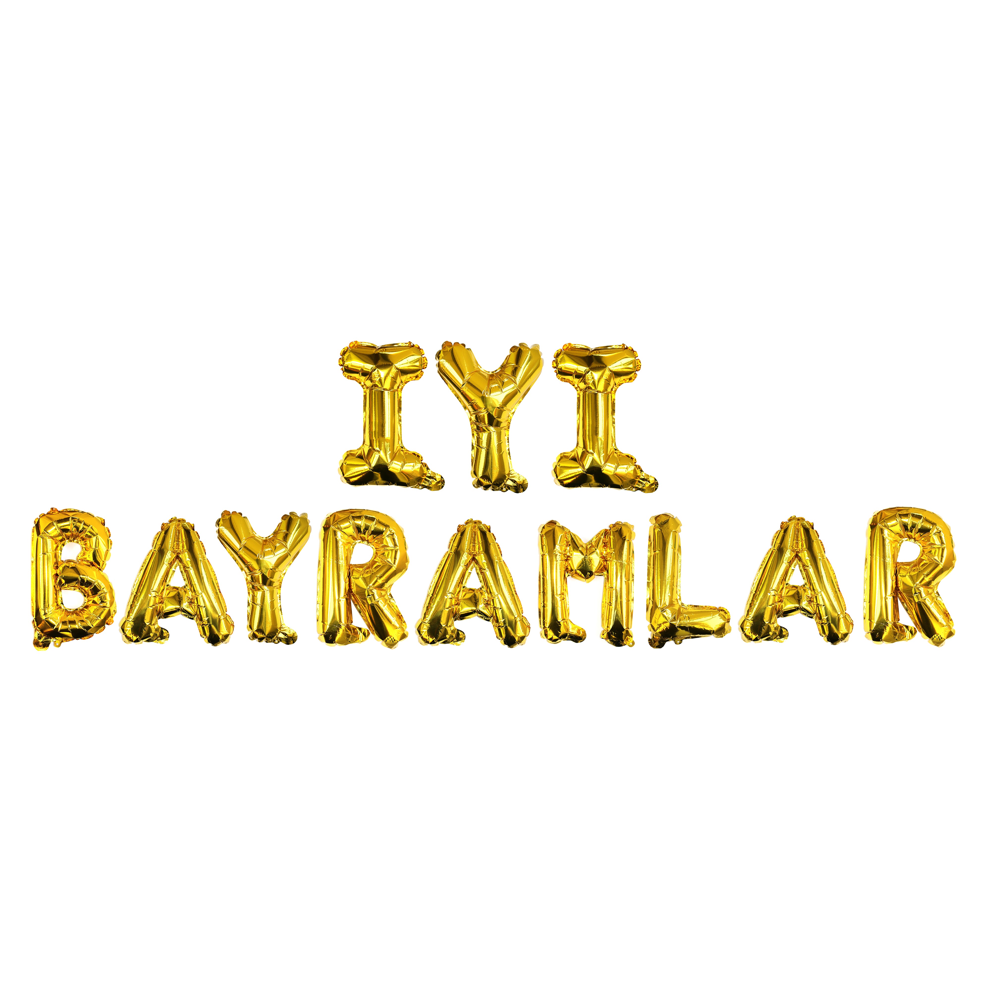 • Gold 'İyi Bayramlar' Turkish auto-seal foil Eid balloons. Includes 12x letters & 1x Moon and star.