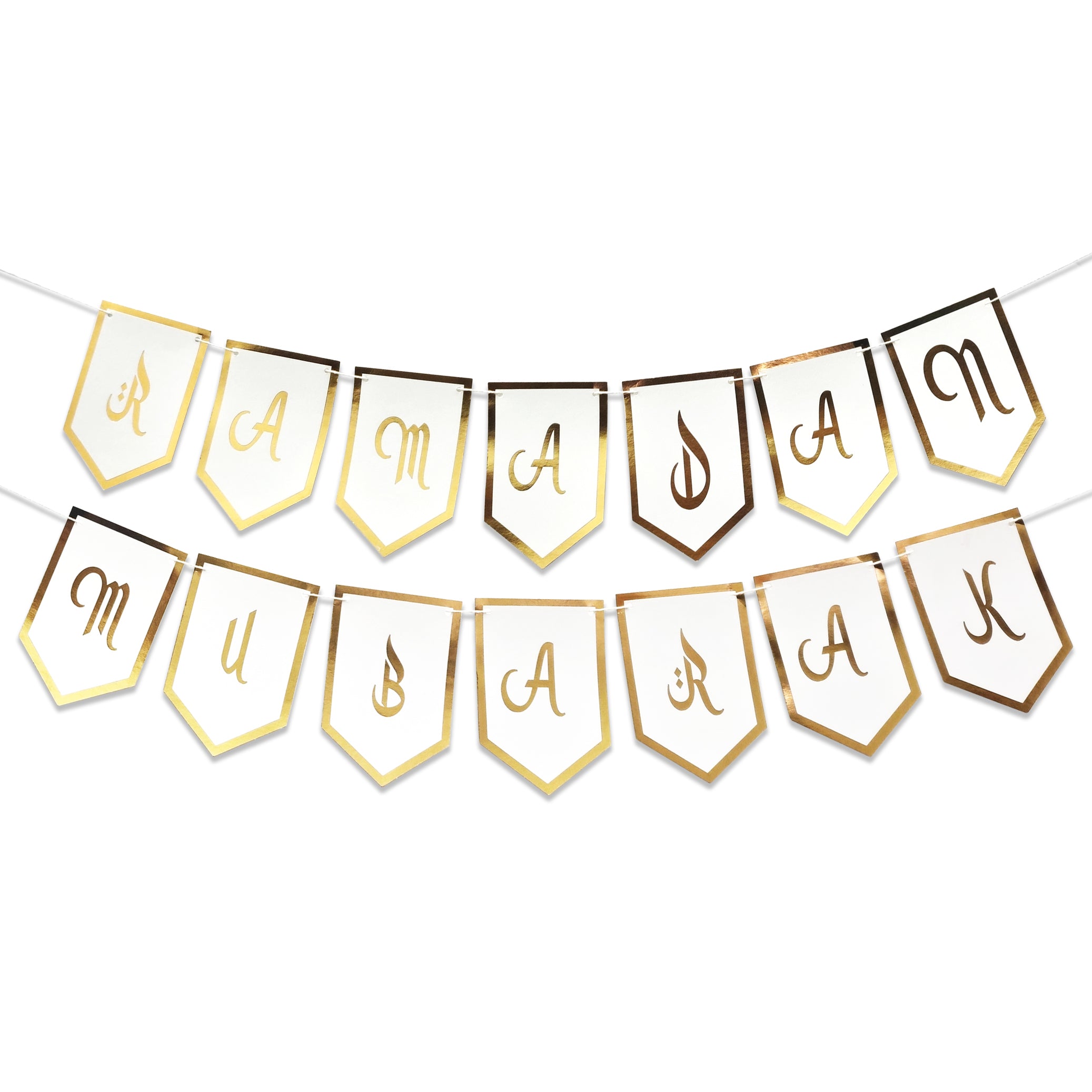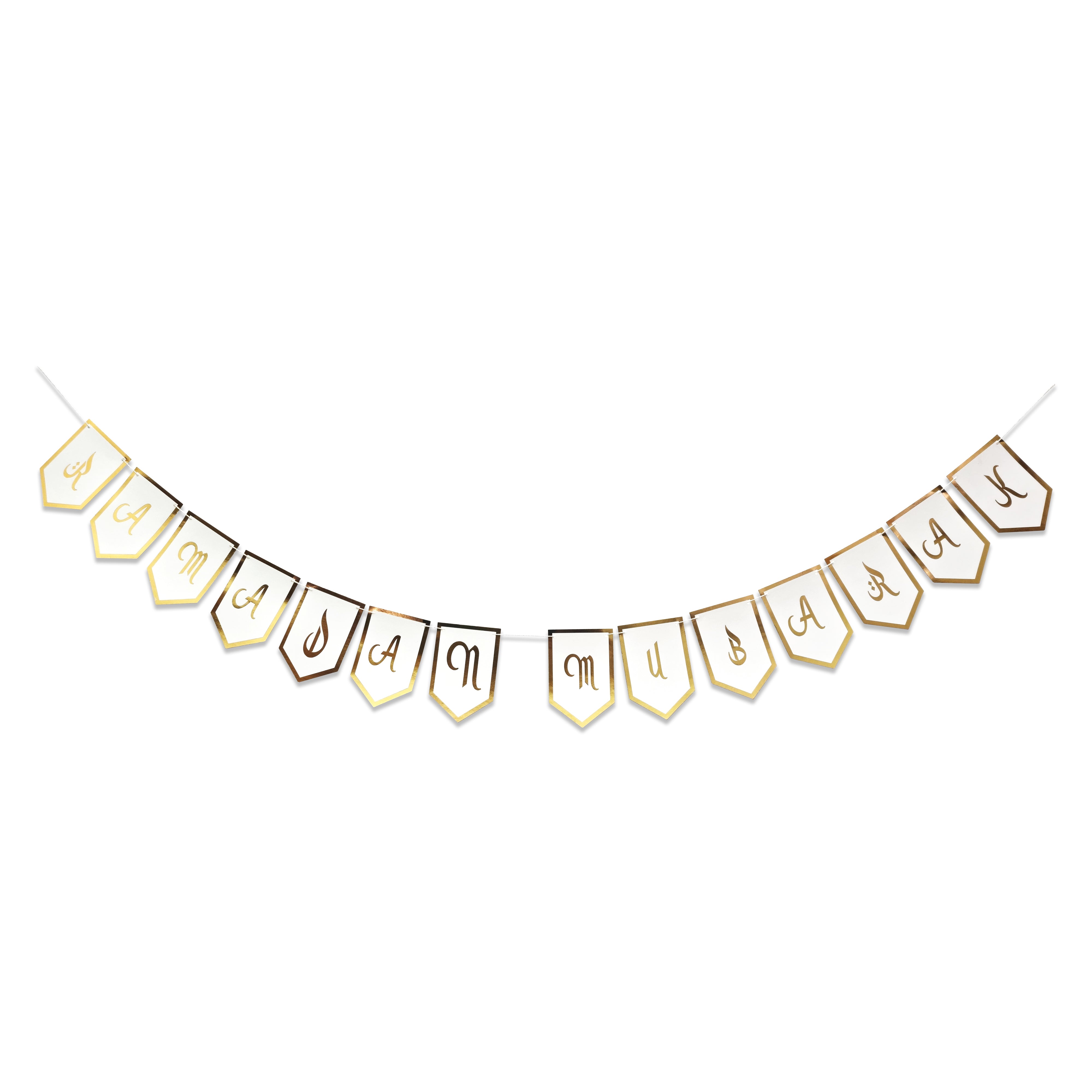 • Celebrate Eid in style with our White & Gold 'Ramadan Mubarak' pointed pendant card bunting