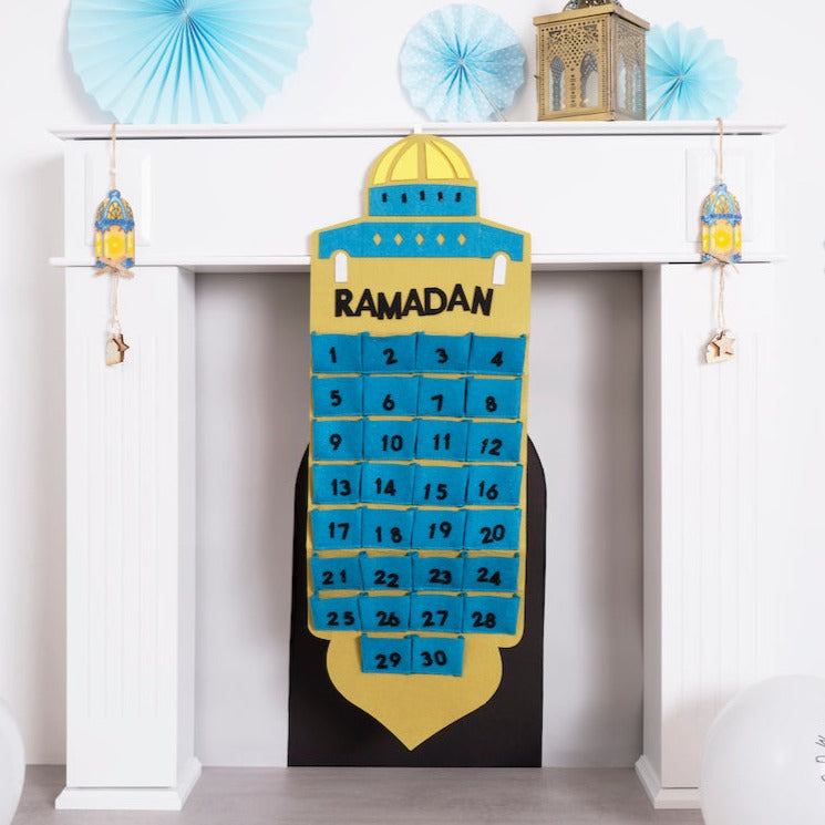 • Large reusable mosque shaped Ramadan felt hanging calendar with numbered pockets. Approx Size: Length: 91cm / Width: 31.5cm. Individual pocket size: 7cm x 5.5cm.