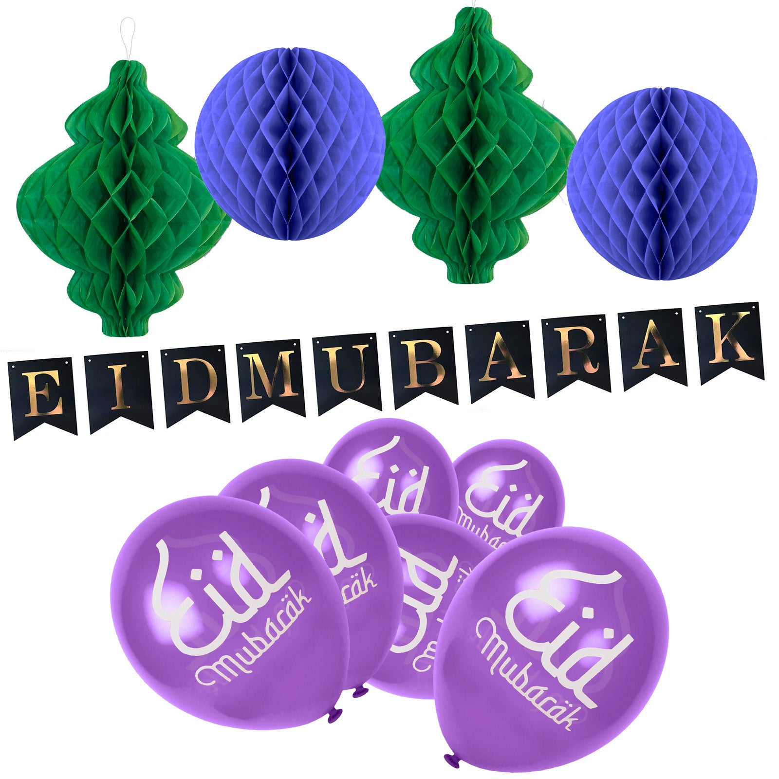 Black & Gold Eid Mubarak Bunting, Green & Purple Lanterns & 15 Green/Red/Purple Balloons