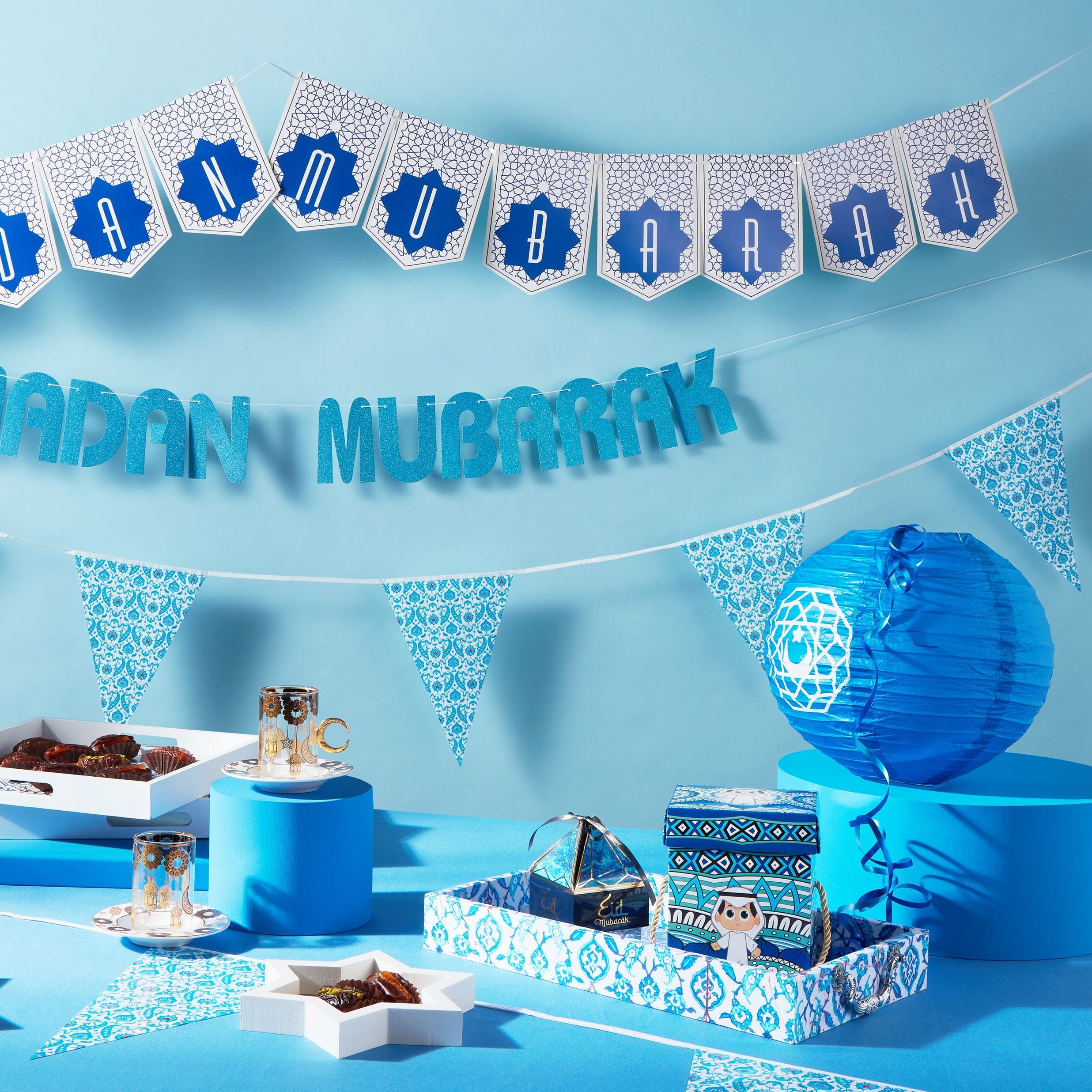 • A blue geometric pattern Ramadan Mubarak bunting made from card. Each flag measures 21x15cm and is 2 meters in length.