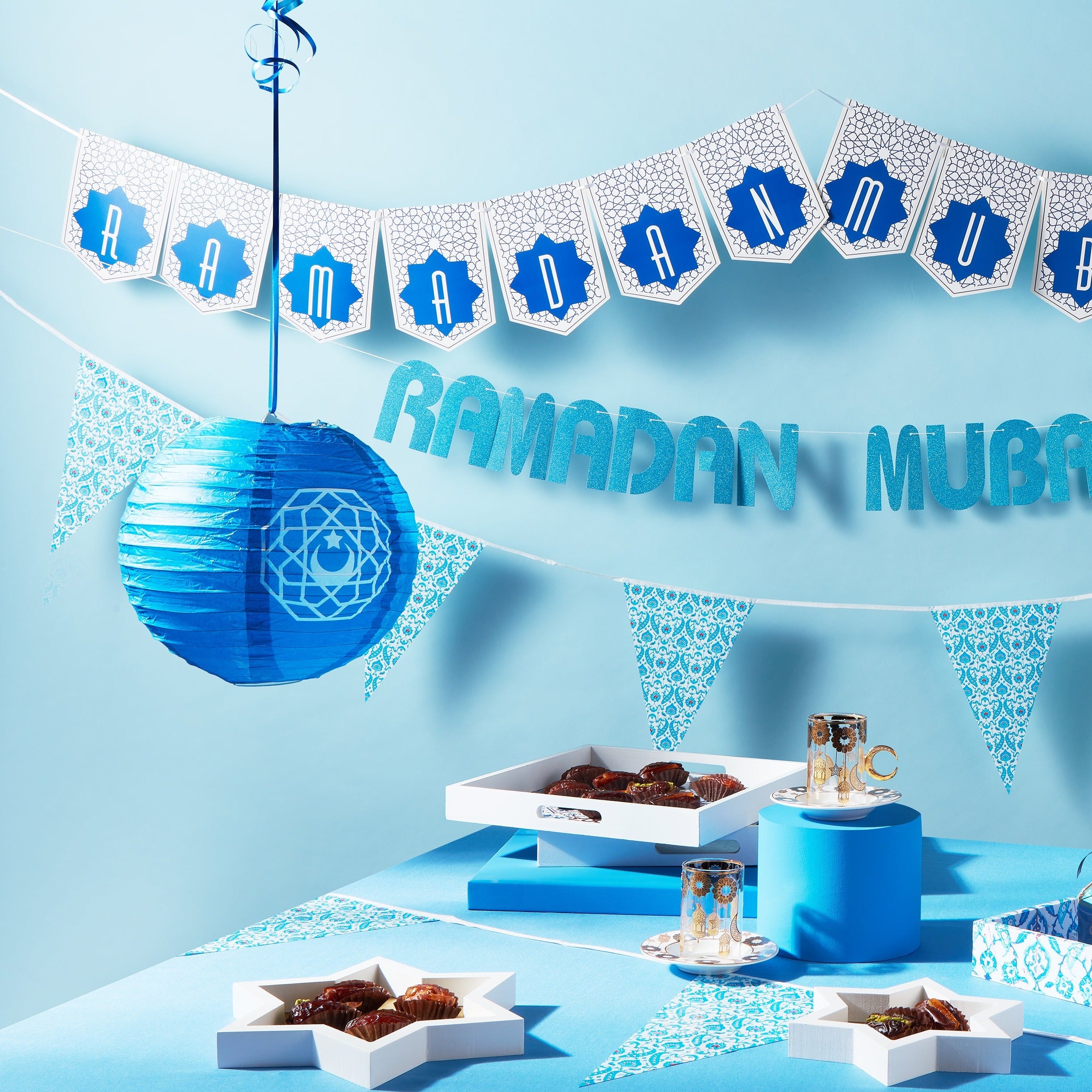 • A blue geometric pattern Ramadan Mubarak bunting made from card. Each flag measures 21x15cm and is 2 meters in length.