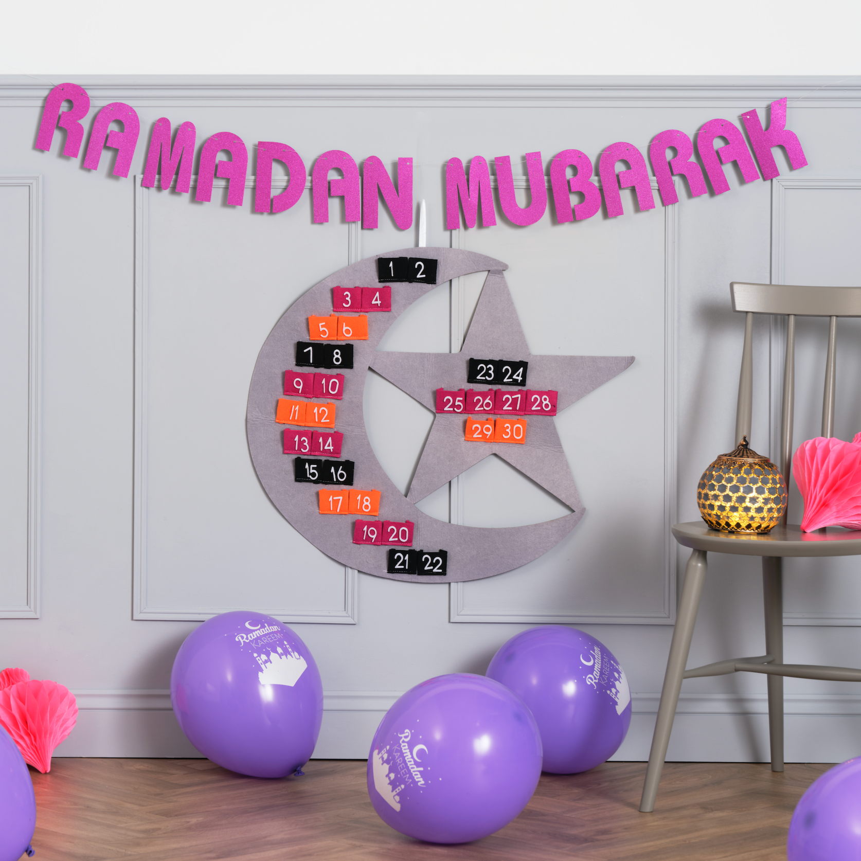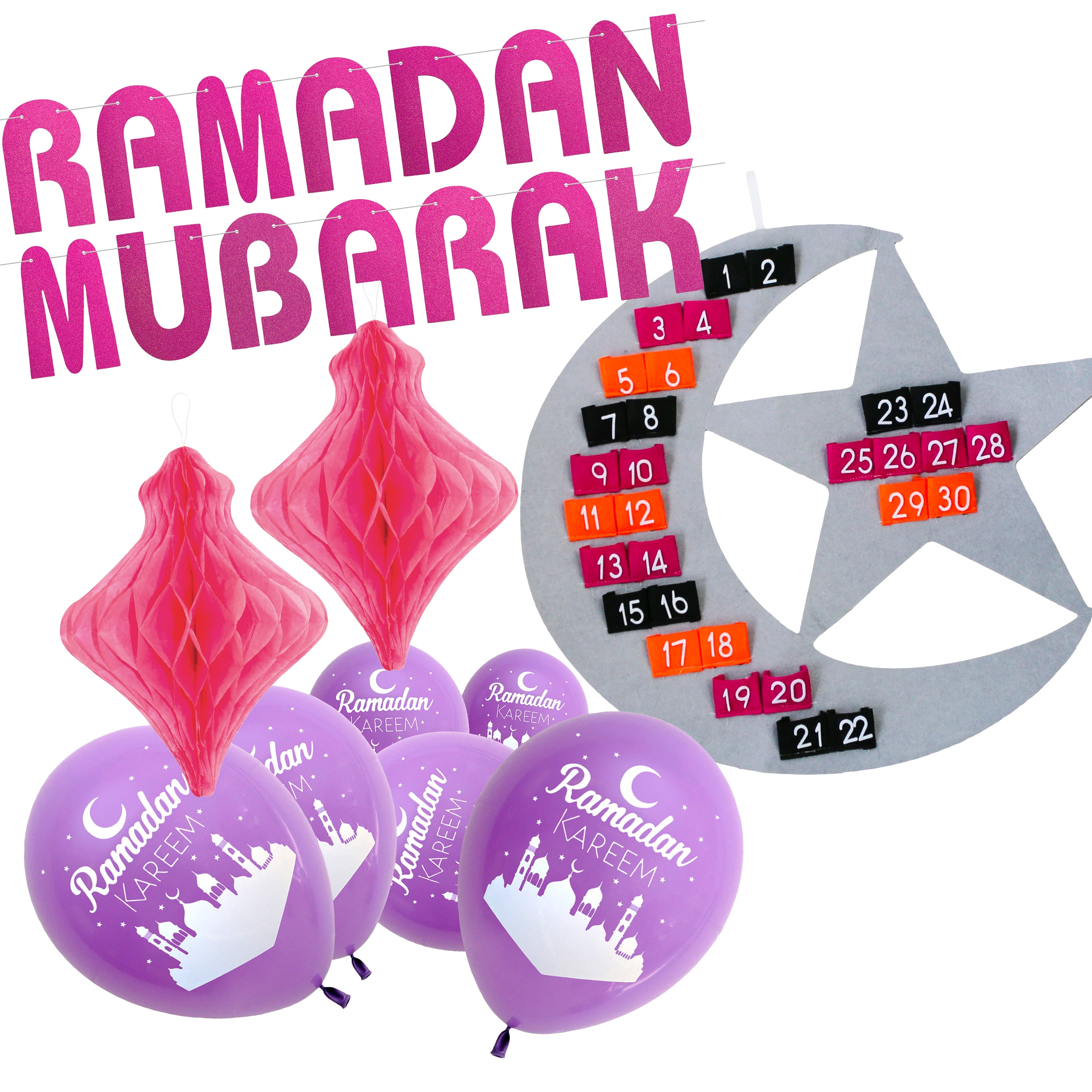 Crescent Moon Ramadan Calendar, Pink Bunting, Paper Lanterns & Balloons Decoration Set