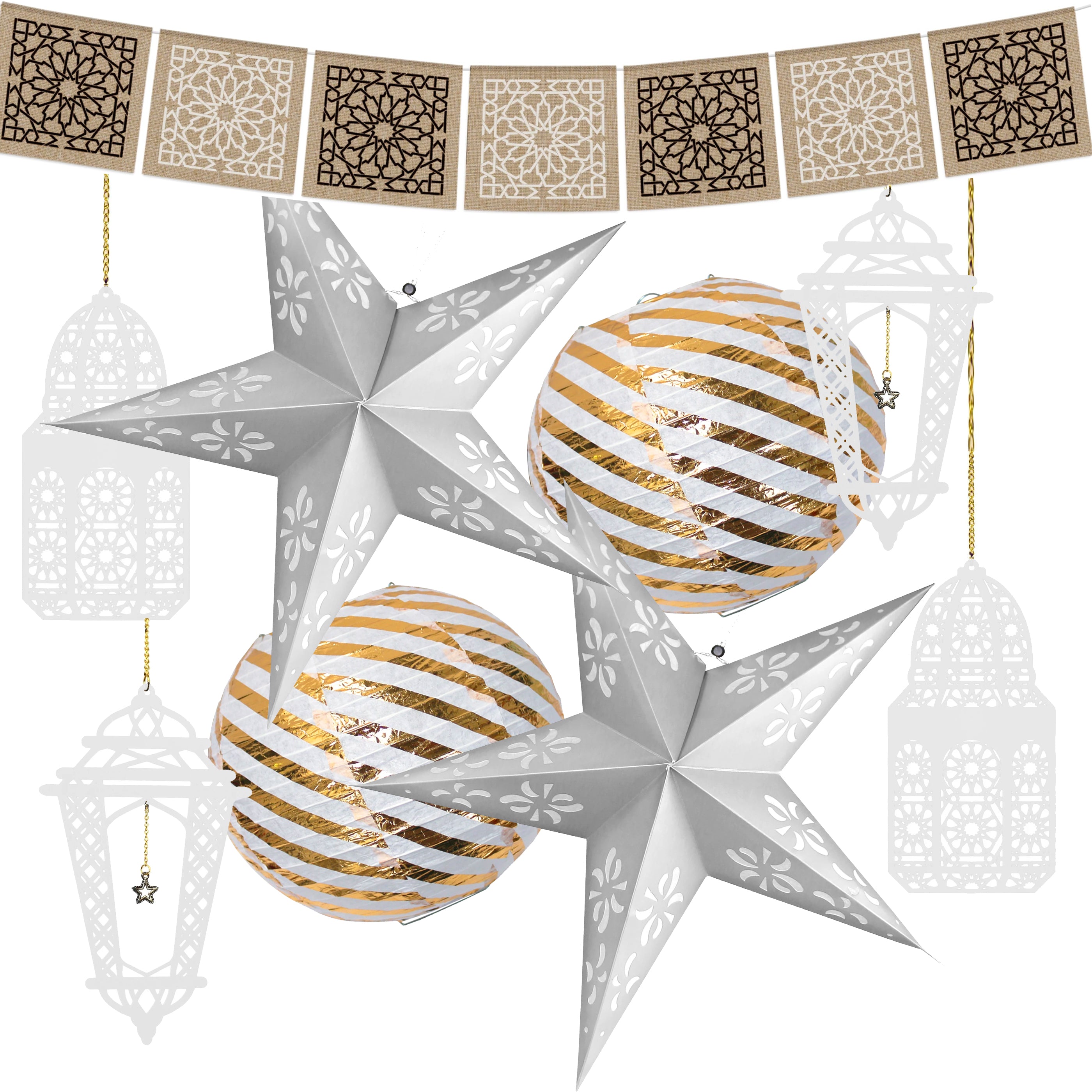 Eid al-Adha / Bakra / Kurban Bayram: Hessian Bunting, Silver Stars, Gold Paper Lanterns & 4pc White Wooden Lanterns Decoration SET 51