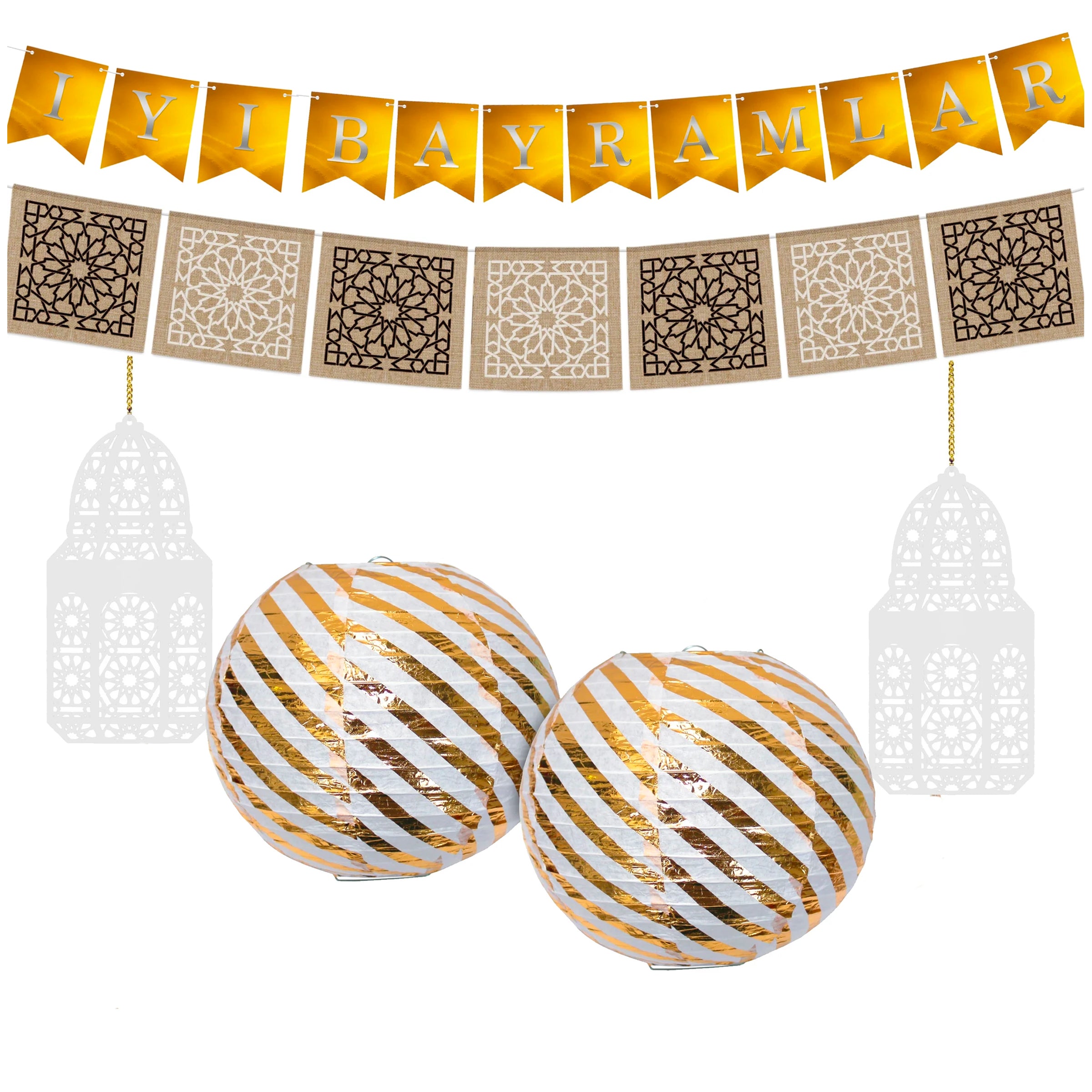 Eid al-Adha / Bakra / Kurban Bayram: Turkish Bunting, Hessian Bunting, Gold Lantern, White Wooden Lantern Decoration SET 41