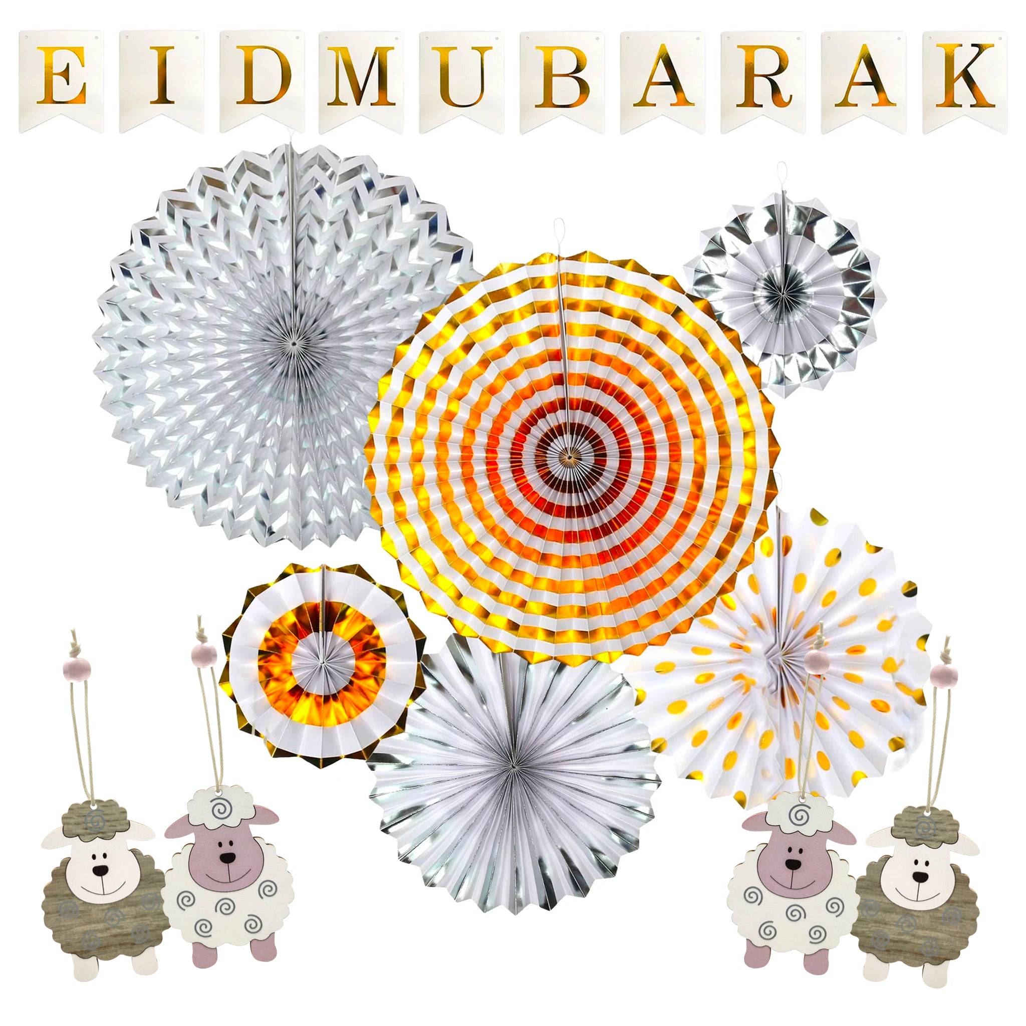 Eid al-Adha / Bakra / Kurban Bayram: White Bunting, Gold & Silver Fans & 4pc Sheep Decoration SET 45