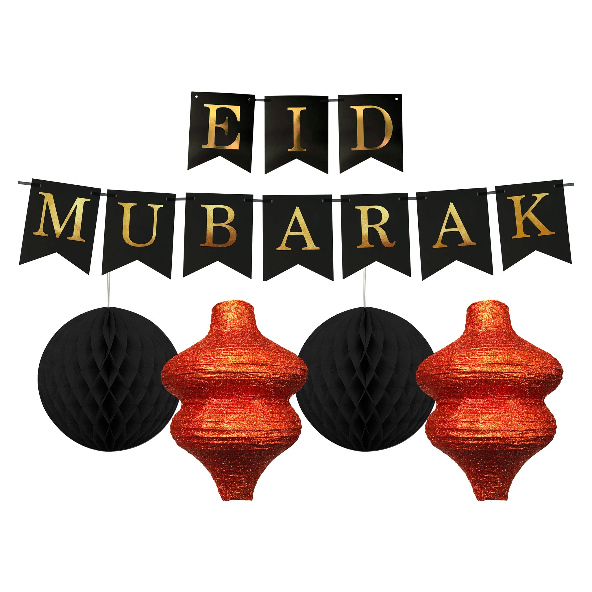 Eid Mubarak Black & Gold Bunting & 4 Lantern Decoration (2xBlack & 2xCopper)