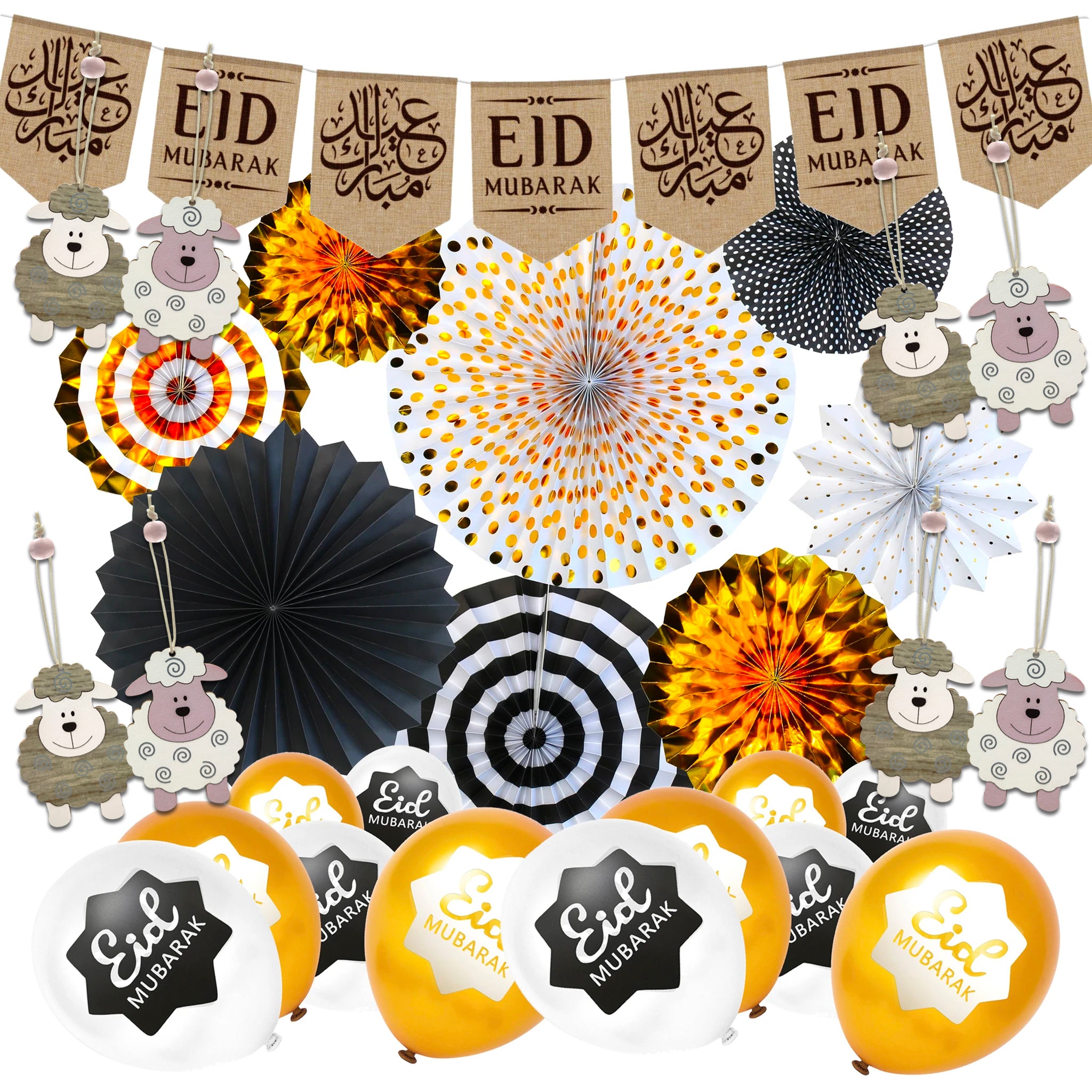 English & Arabic Hessian Bunting, Black & Gold Paper Fans, White & Gold Eid Balloons & 8 Wooden Sheep Eid al-Adha Decoration Set