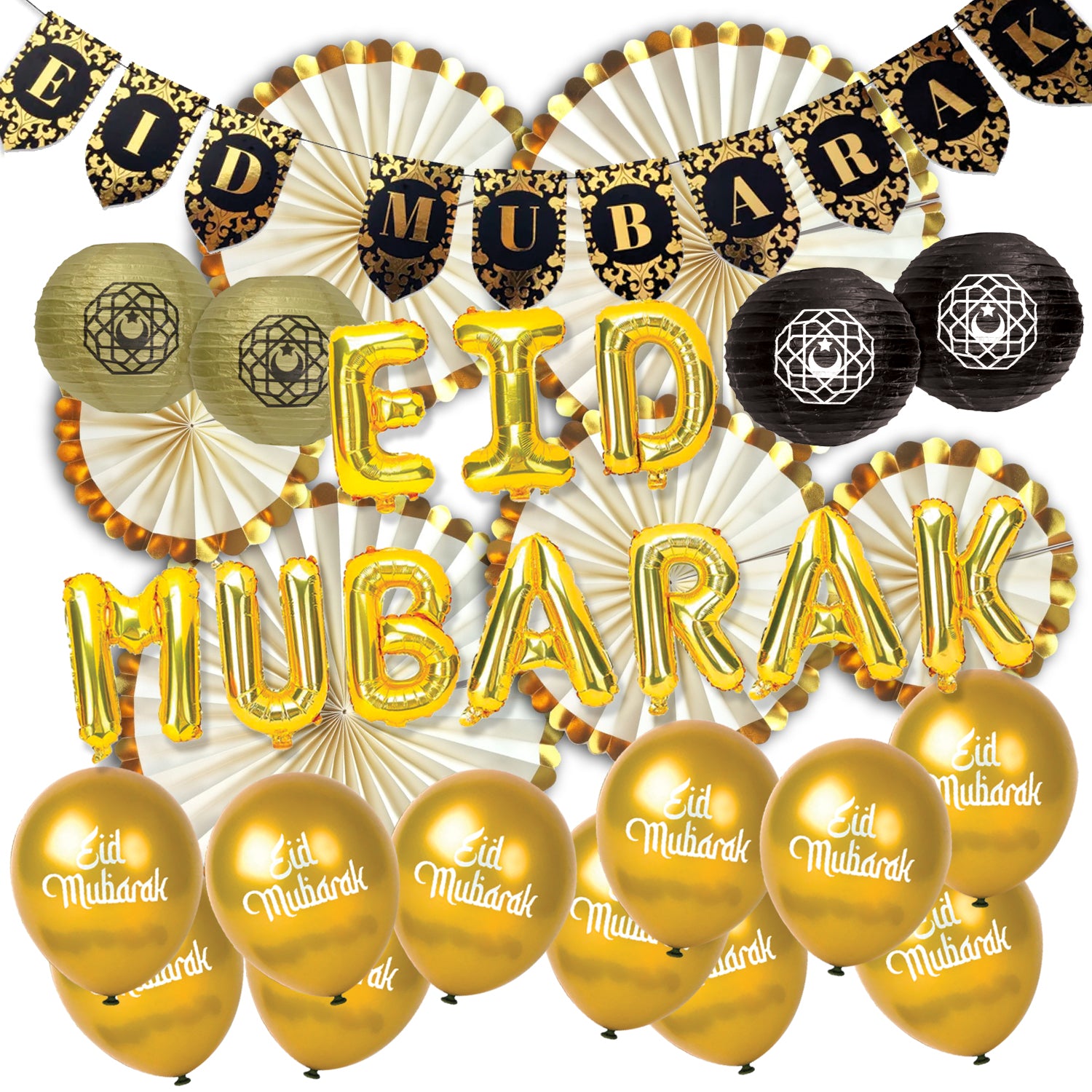 Gold 'Eid Mubarak' Foil Balloons, Card Bunting, Latex Balloons, Lanterns & Fans Set (Set 23-13)