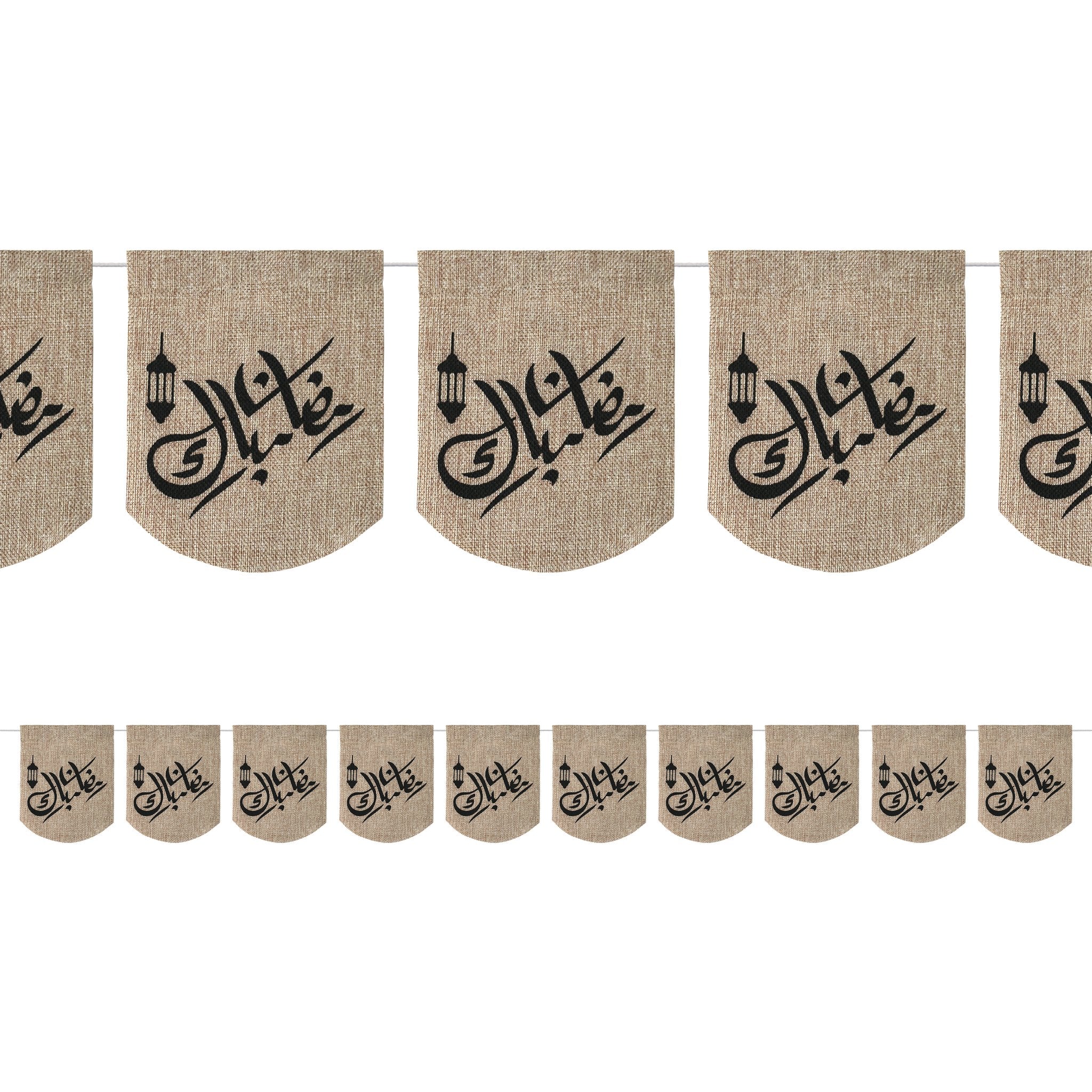 • Natural hessian bunting printed with 'Ramadan Mubarak' in Arabic print - 10 round edged flags - Approx individual flag size 20cm x 15cm on 2m hanging string