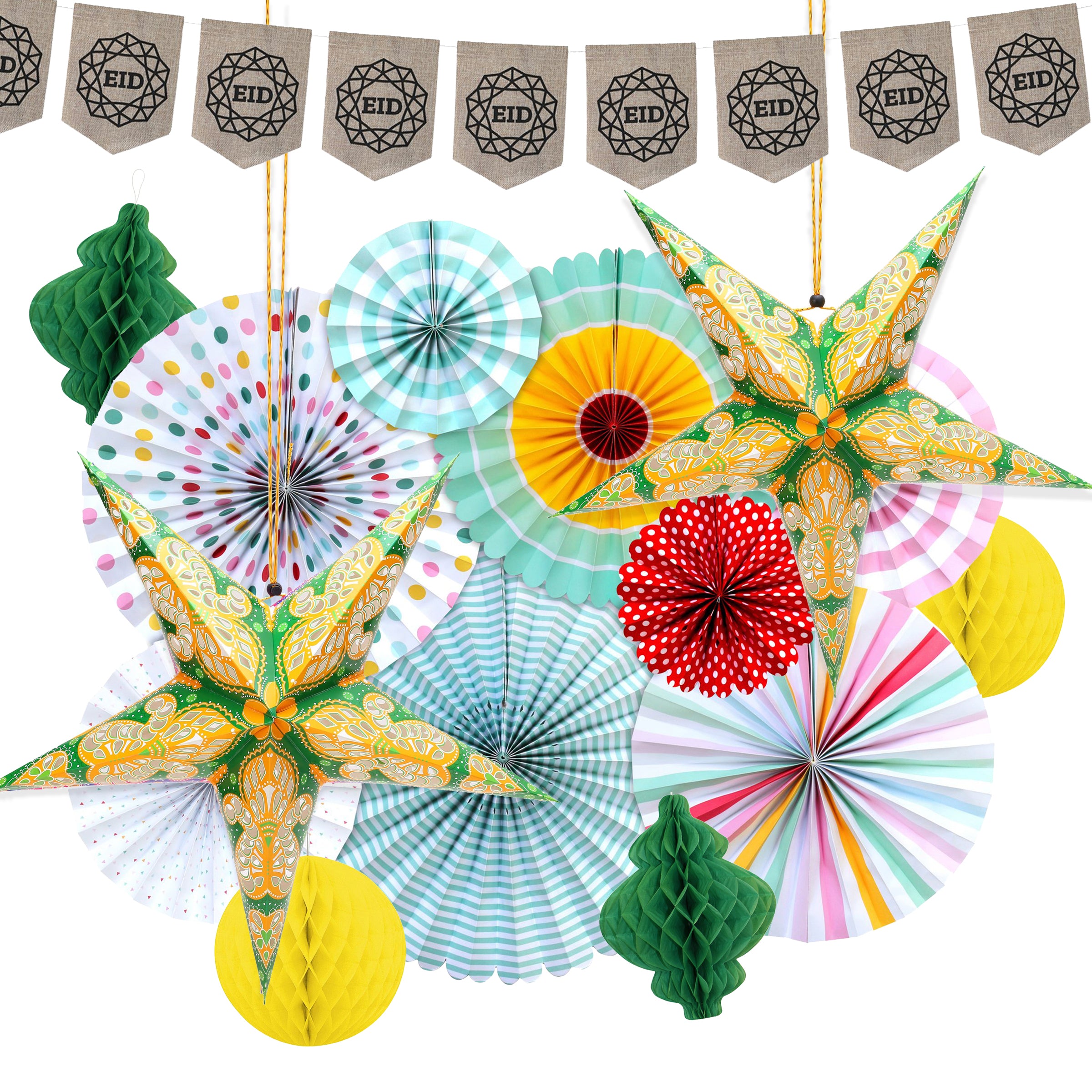 Hessian Geo Bunting, Pastel Fans, Large Green & Pink Stars + Yellow & Green Honeycomb Lantern Decoration SET 23